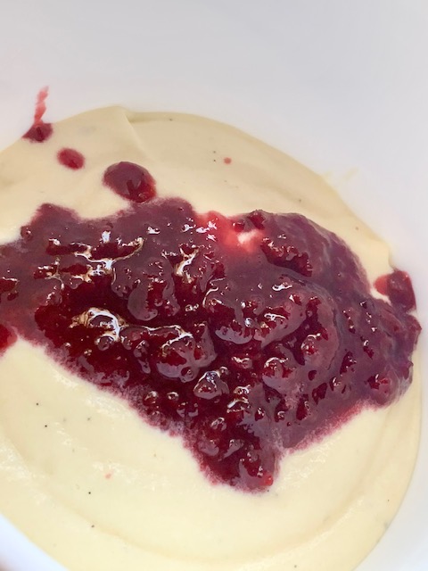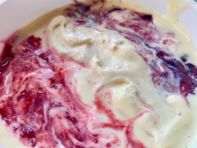 Disclaimer: This is RICH. Like thick, sweet, creamy and decadent RIIIIIIIIIIICCCCHHHHHHH. The good news, is you can add all sorts of yumminess to it to change it up if you want. I chose to use some leftover Peppered Cherry Preserves and muddled fresh blueberries… But you could add chocolate chunks, or crumbled cookies… I mean, vanilla ice cream is a blank slate. Enjoy it on its own, or get working on a great flavor combo. But no, this is not your ‘I eat a huge bowl of ice cream every night’ ice cream. Unless you burn like 4000 calories a day.
