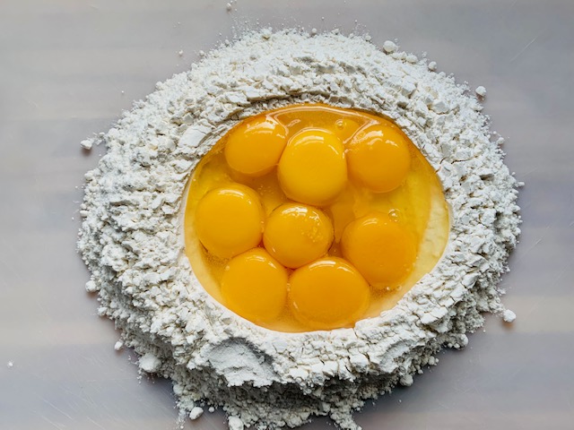 7. If you get close to ‘breaking down’ a bit of wall, just use your hand to build it back up and continue to widen your well, incorporating more and more flour to the egg…