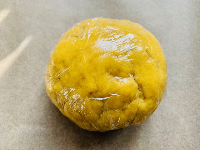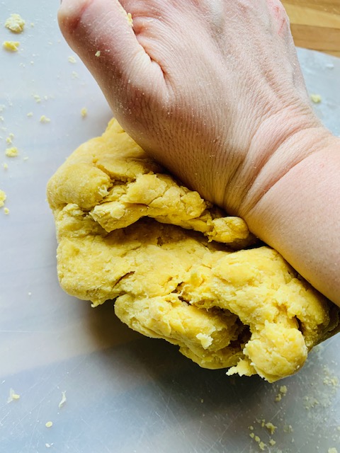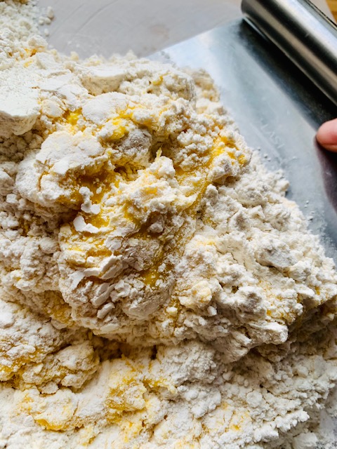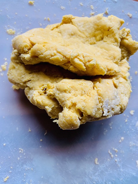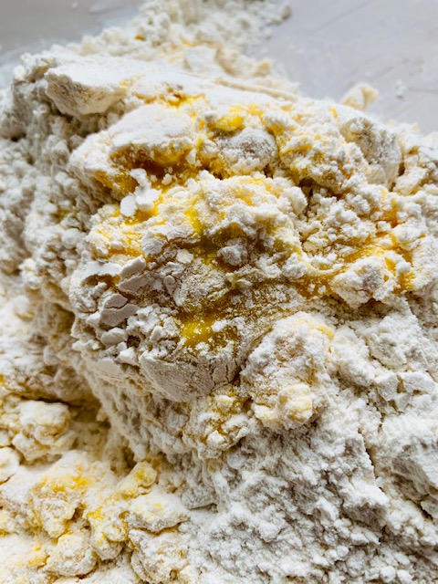 9. At this point, you have a very ODD mix on the working surface. Almost a half loose flour, half yellow, shaggy dough.