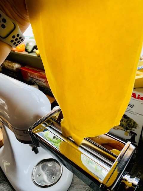 5. Now is the ACTUAL fun part: ROLLING! Turn your roller/mixer with roller attachment on LOW and holding the dough in your right hand (over the roller) let it pass through, catching the exiting sheet with your left hand below. Pass it through a few times initially, and fold sheet in half, turn 1/4 rotation and then pass through again. This just primes the dough and gets your glutens ‘working’ for you in the rolling process.