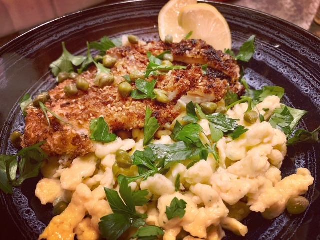 This is the tale of the BEST chicken schnitzel in the world (that I’ve experienced) that was eliminated from our local’s menu. I mean, it was over spaetzle! We were DEVASTATED. Like, 3 years later, after a glass of wine or so, we STILL casually bring it up with the owner. Granted, that chef has moved on, and several others have come and gone since… as the fabulous eatery has gotten more popular and has grown into its’ popularity very well… but still. It. Was. AMAZING. *sigh*