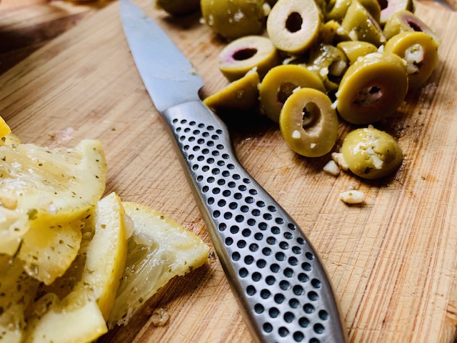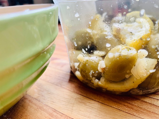 - As your dough finishes its first rise, chop and prep your olive mixture. Take marinated olives out of brine/oil and slice or chop to your preference. If there is not a ton of garlic and you are a garlic lover like me, add in approx 1 tbsp of garlic to the prepped olives. I also like to add a bit of lemon zest to the topping to brighten it up a bit. Set mixture aside until ready to use. (OR just use Whole Food’s AMAZING Lemon Garlic Green Olives... ugh, addicting.)