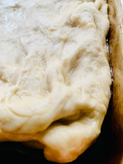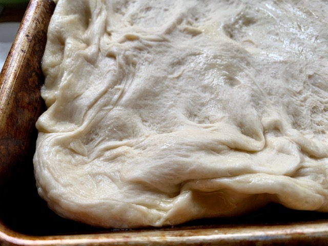 - Once your dough has doubled in size, turn out onto a lightly floured surface and stretch out into roughly a 9×13″ rectangle. Carefully lift and place dough into prepped baking pan, pressing it out into the corners. This might get a little messy due to the oil, so pre-stretching it to an approximate size of the pan helps. You want to keep as much of the oil in the baking pan as possible (giving a nice crust and oil absorption into the bottom of the dough.)