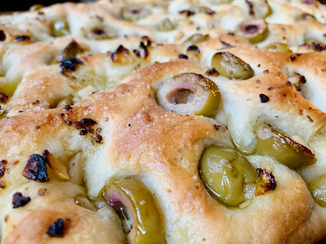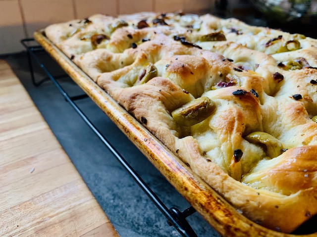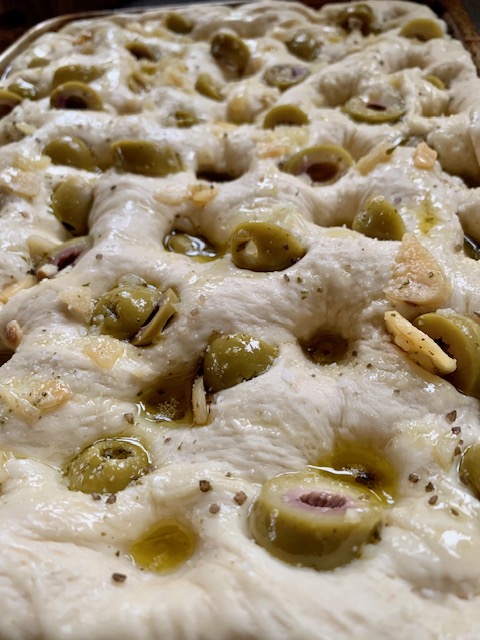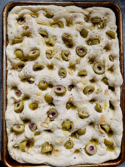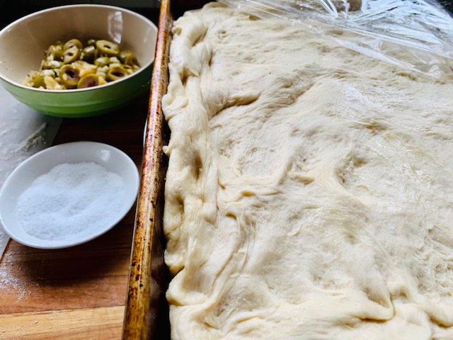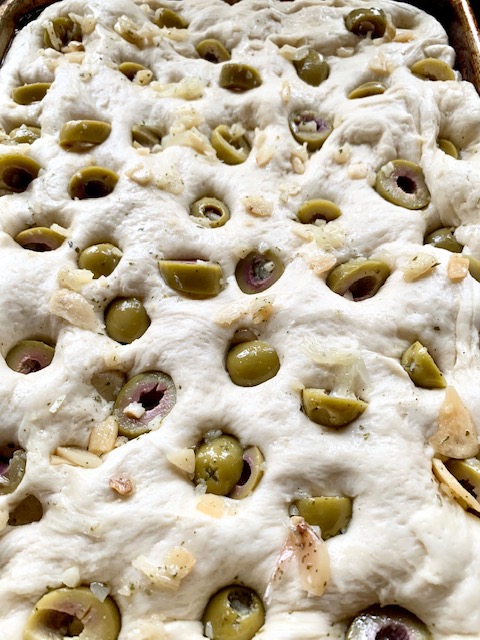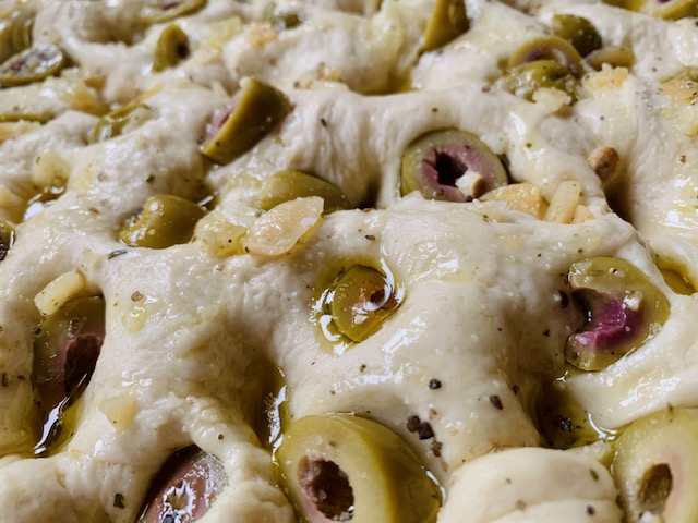 - Once it has puffed up again, take your topping and sprinkle across the top of the dough, pressing the olive pieces into the dough slightly. Get a good, even disbursement of that tasty olive topping… so every piece will have great flavor.