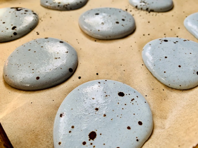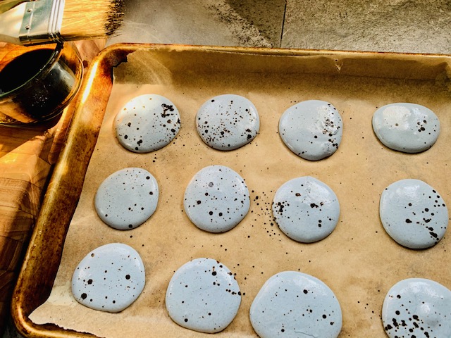 - NOW to speckle! Take 1/2 tsp of brown gel coloring and put in small bowl. Use a few drops of vodka (I used Grappa) to thin a bit so you can ‘splatter’ little drops across your wet shells.