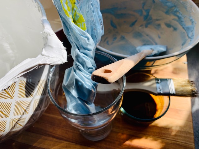 - Add in your gel/food coloring. I used about 1/8 tsp of Delphinium Blue (Wilton’s). This will make the paste a darkish blue (much darker than a robin’s egg…) This is ok. You are going to be diluting the color with a ton of meringue so it will lighten up! (If using food coloring drops, try 5 or 6 drops of a deep blue with 1 drop of brown….)