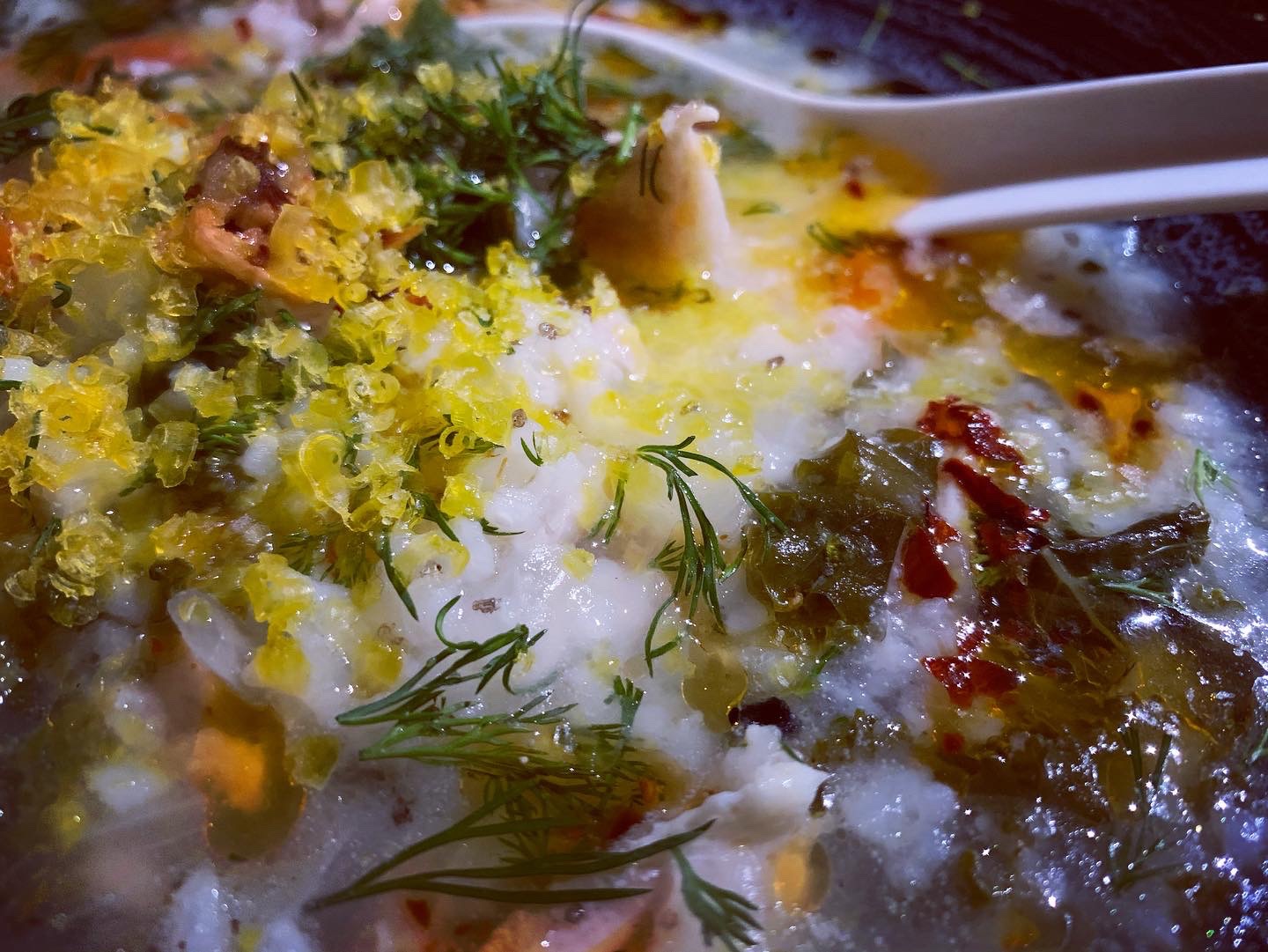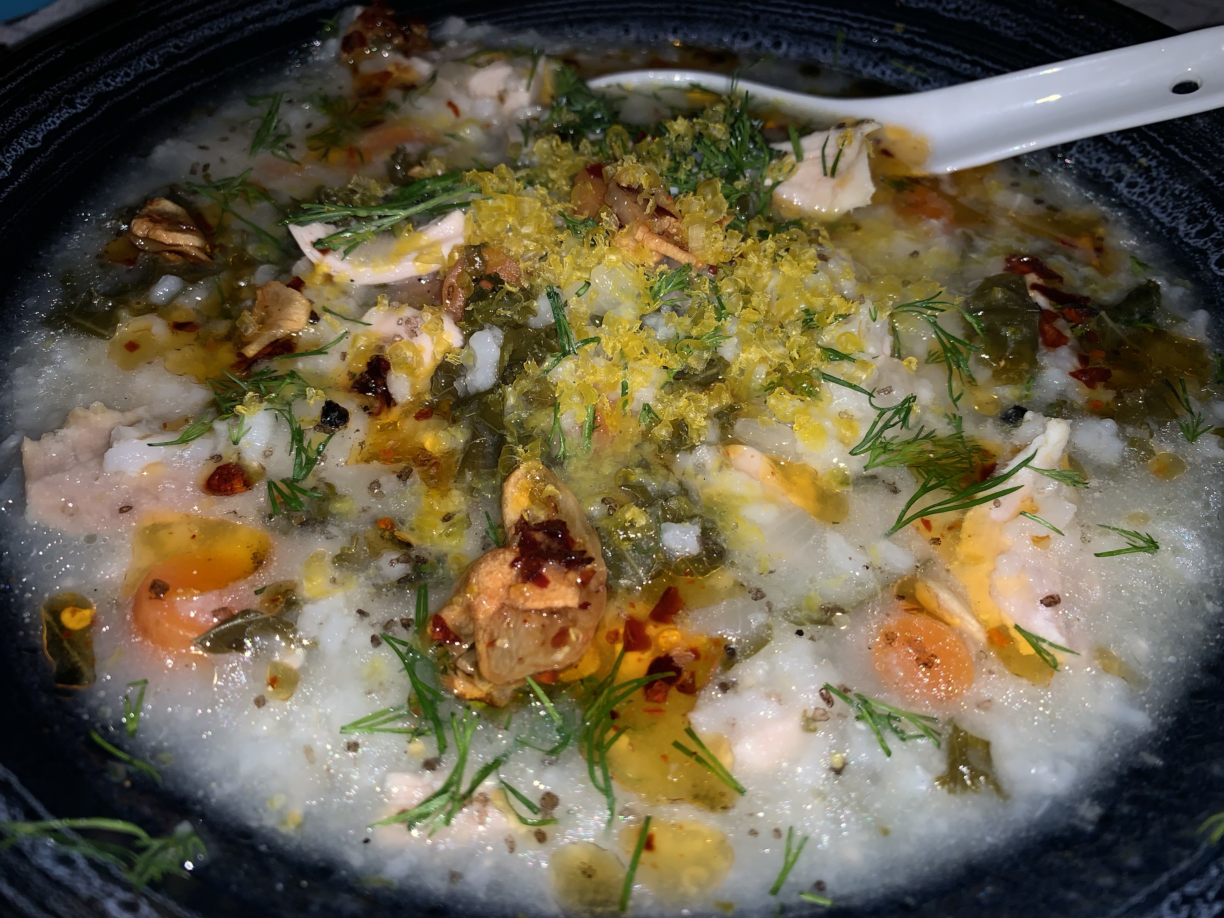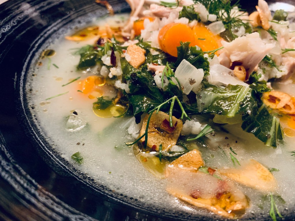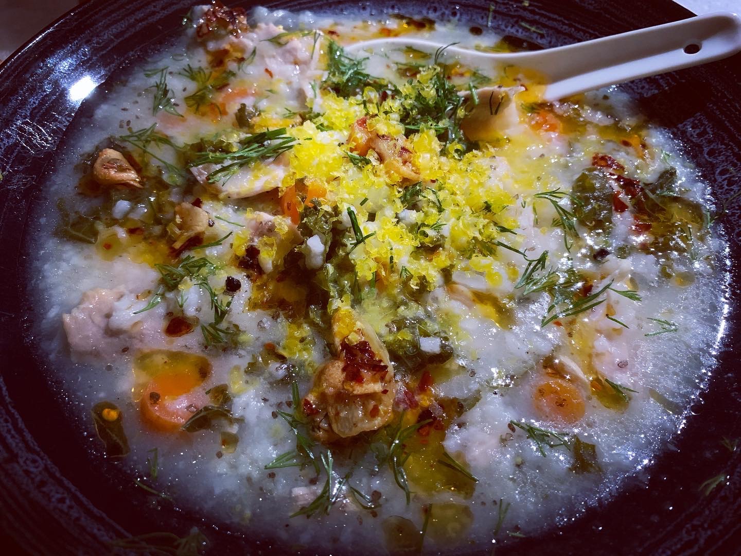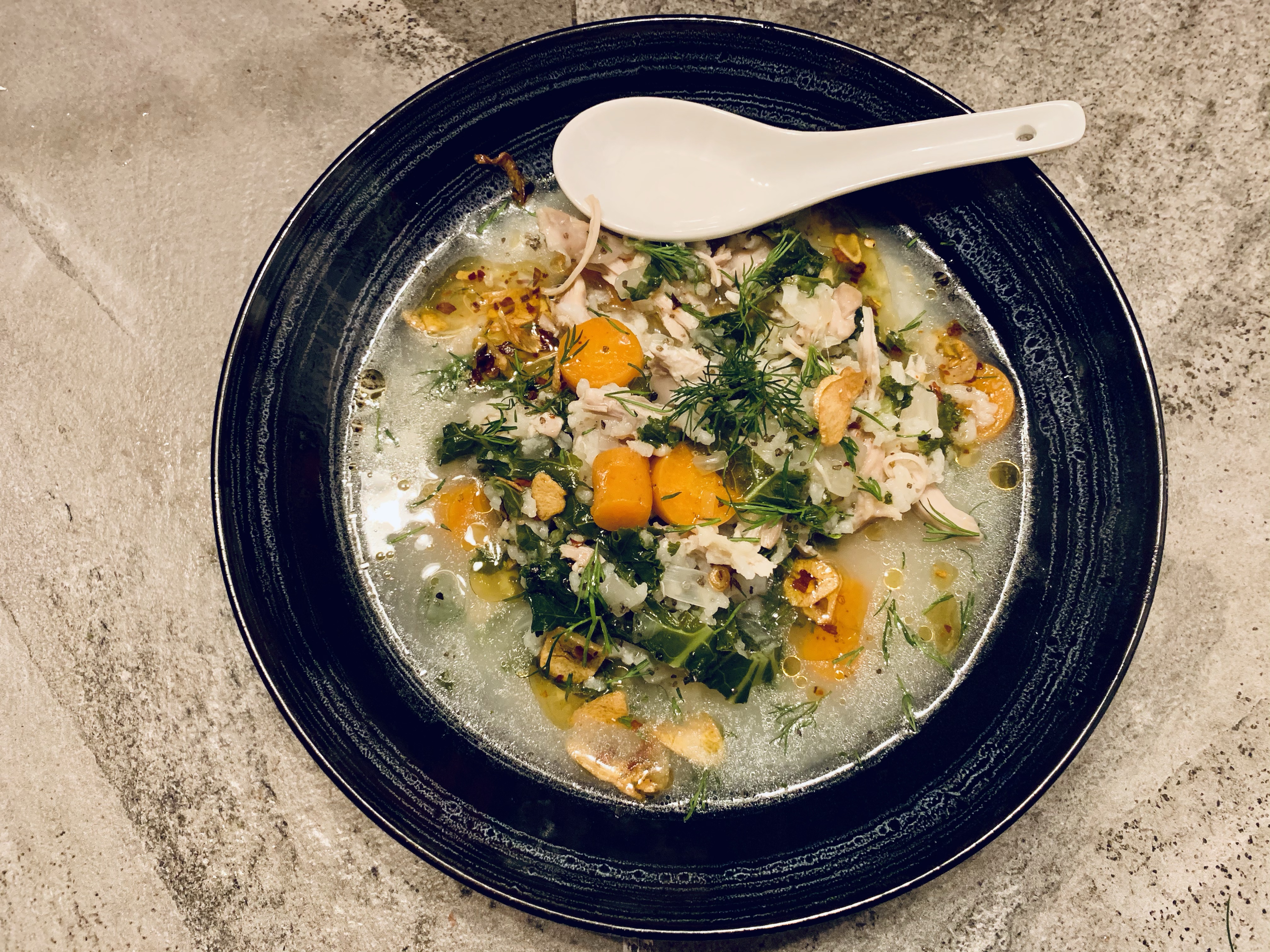 I firmly believe soup should be a year round thing. This soup base comes from one of my fave Bon Appétit recipes and I adjust it seasonally and it is always AHHHHMAZING. This version is our new fave, changing up the rice to make it a bit more brothy, bringing a bit of ginger into the mix as the seasonal changes (and allergies) are starting to hit us all, as well as using some of our favorites: homemade crispy garlic chili oil and Alderwood smoked salt.