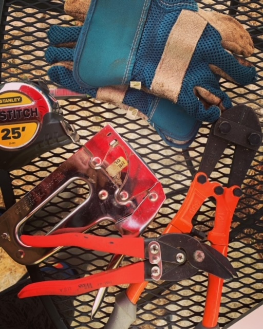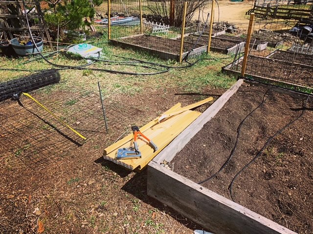 - Enclosed 6 of 10 garden beds (build 12 end walls from wire and post)