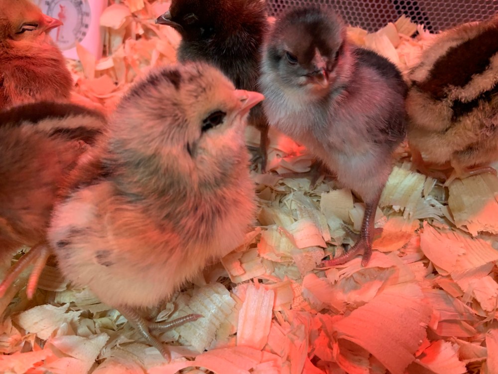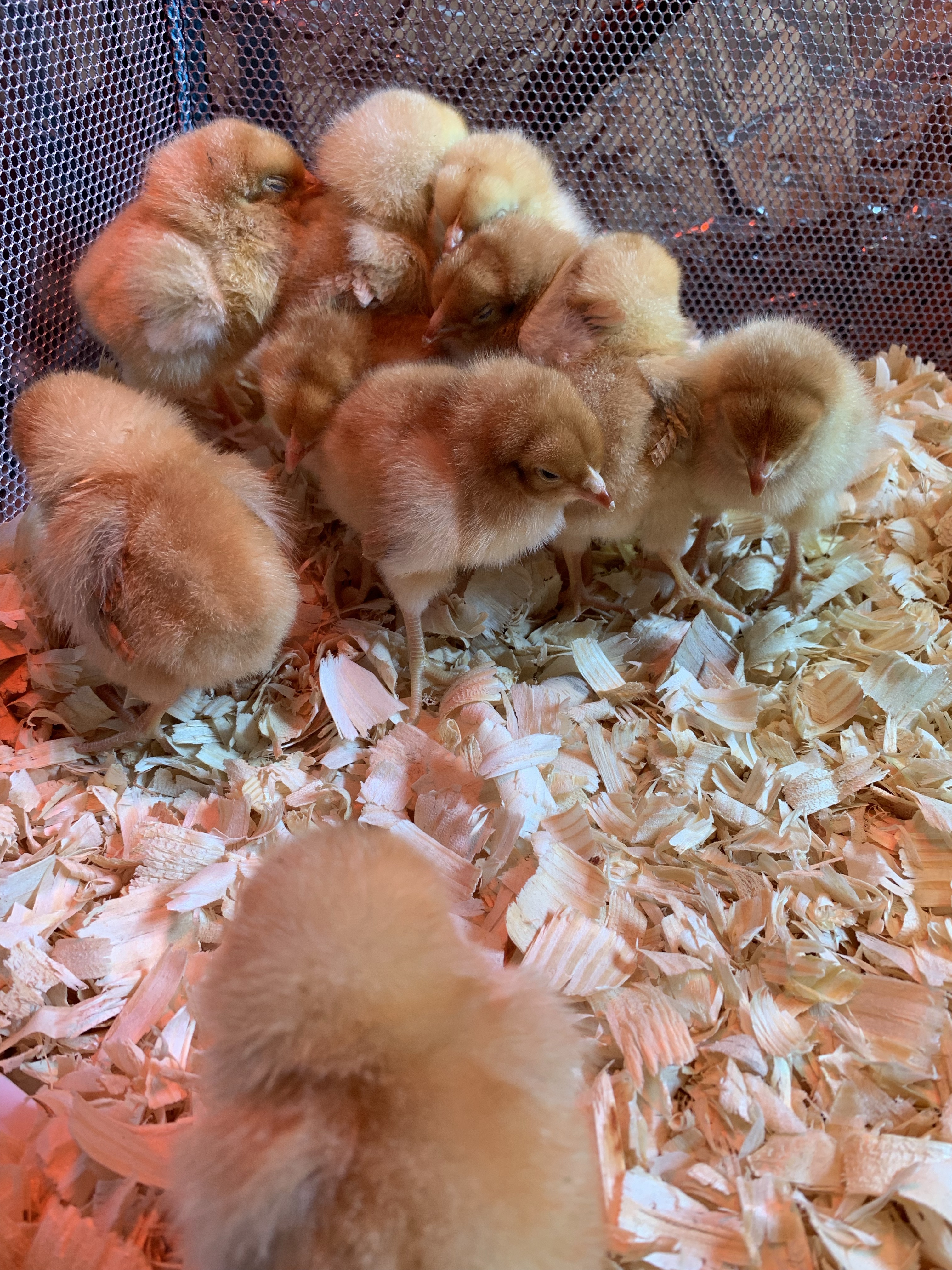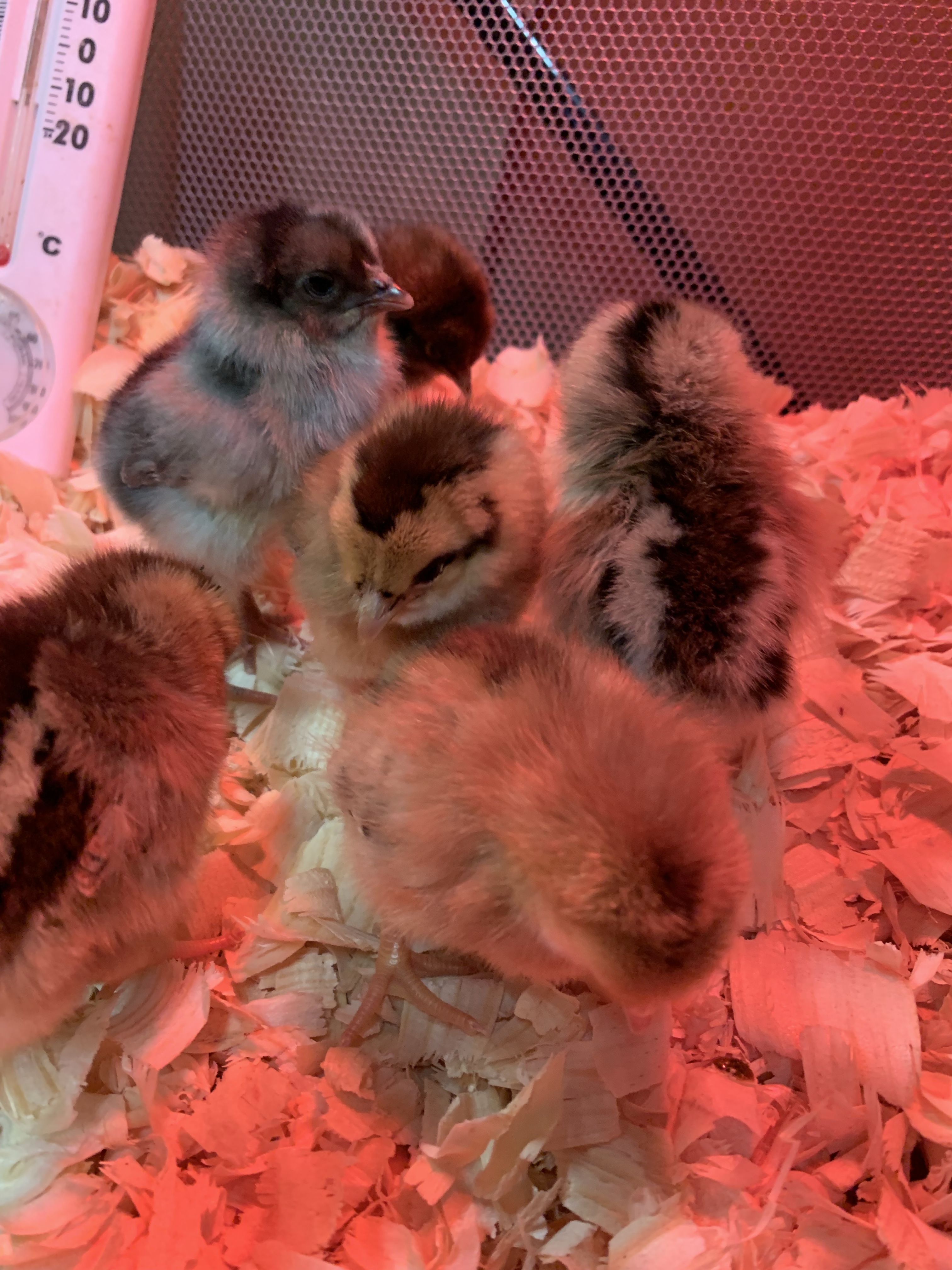 - MANAGE TEMPERATURES in each pen. From hatch to 7 days, they chicks will need a space in each pen that is 95 degrees. There are many ways to accomplish this, from a basic heat lamp pointed at an area of you pen/brooder, to a heat plate that is very localized heat. Chicks are also super smart…. if they’re too hot, they will move where it is cooler… if they are cold, they will seek out heat. Each successive week of the chick’s life (until about 4 weeks) you will lower the temperature in their ‘heat zone’ by 5 degrees… so from day 8 to day 14 = 90 degrees, day 15 to day 21 = 85 etc… you will see their feathers come in quickly starting in week 2 so once they are ‘feathered out’ (no fluffy just feathers) they are able to maintain their body temp better and eventually after week 4 usually you can eliminate the heat lamps or use very sparingly if your evening temps are cold.
