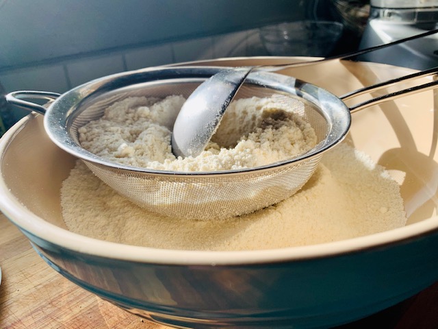 - Once pulsed, take dry mixture and pass through a fine mesh sieve into a large bowl. Using a large spoon often helps sift this quicker. This is to remove any flour particles that are too large and will impact the smoothness of the top of your shell. You will wind up with approx. 1 tsp of solids in the sieve. Don’t worry! Just toss them!