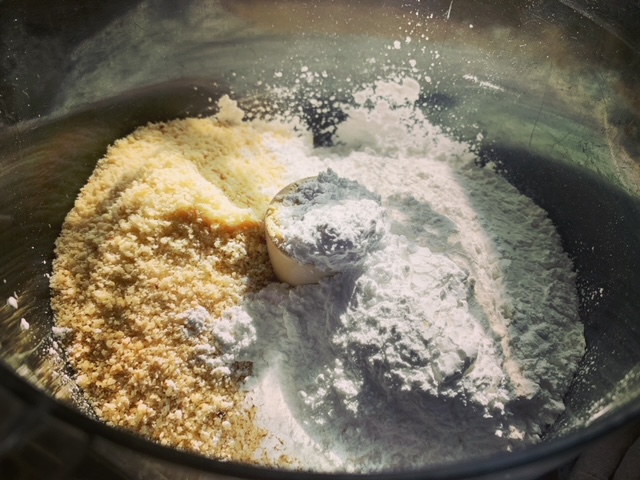 - Take your confectioner’s sugar and almond flour and place in food processor and pulse to fully combine. I don’t find this is necessary to make the grind on the almond flour finer, but it fully incorporates the two dry ingredients better than mixing on your own in a bowl.