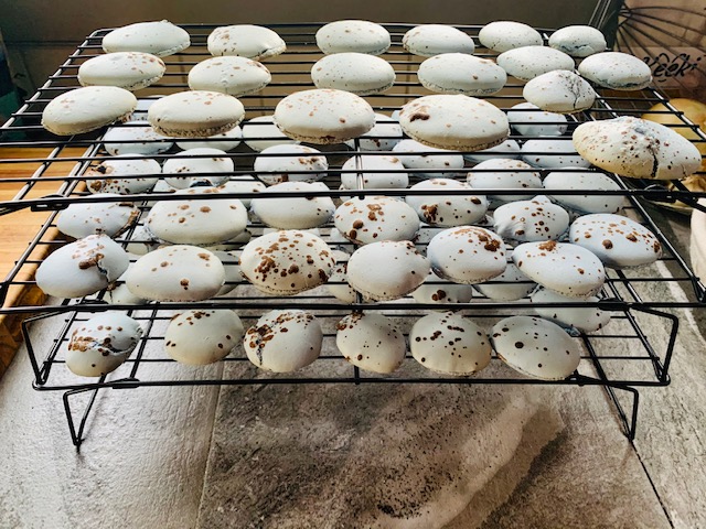 - Now, let your trays of shells DRY for 30-60 minutes. This allows them to form a SKIN along the top and is how you end up with a nice round dome sitting on top of ‘feet’. You should be able to touch the top or run a finger along the top without it sticking.