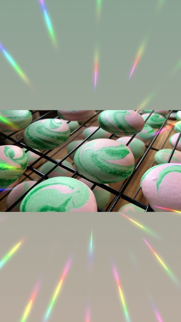 Coloring the shells happens in step 3 here, adding swirls is by adding stripes of coloring to the piping bag before filling and multiple colors… well let’s say that you can find that secret in our Salted Watermelon Poppyseed Macaron recipe. (It’s a bit more involved.)