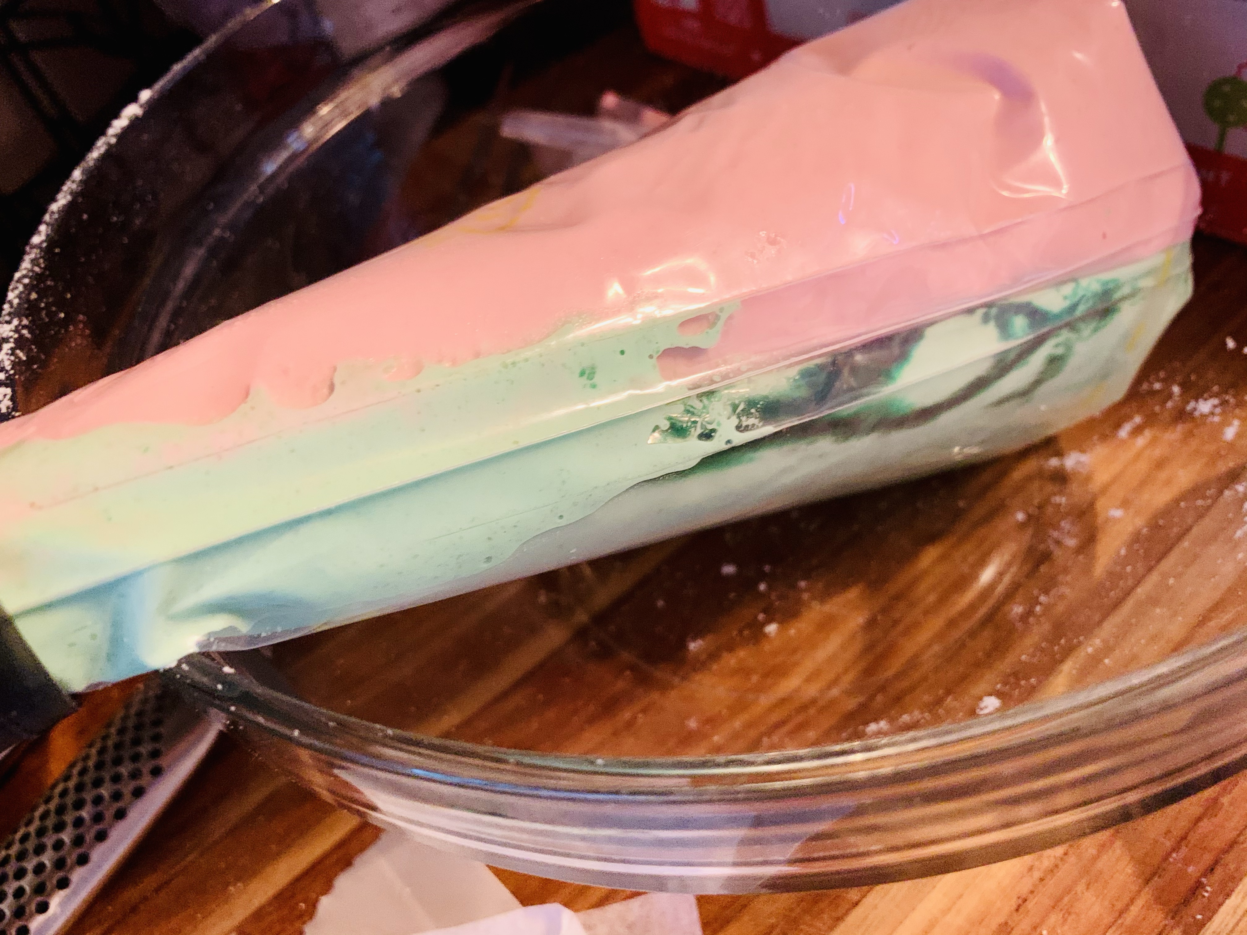 - NOW, it is time to get it to the correct consistency. This is your macaronage. (Macaronage : the technique where you continue folding the mixture past full incorporation until you’ve achieved the perfect consistency.) Again, this macaronage is important because it determines how the batter will pipe when you are making your shells. The easiest way to do this is to continue to use the above folding method until the batter runs off the front of the spatula in a flat ribbon. You want it to continuously fall, without breaking. Once it begins to fall in a ribbon, you will want to try to make a ‘figure 8’ with the ribbon. If you can make a complete figure 8 without it breaking you are ALMOST THERE.