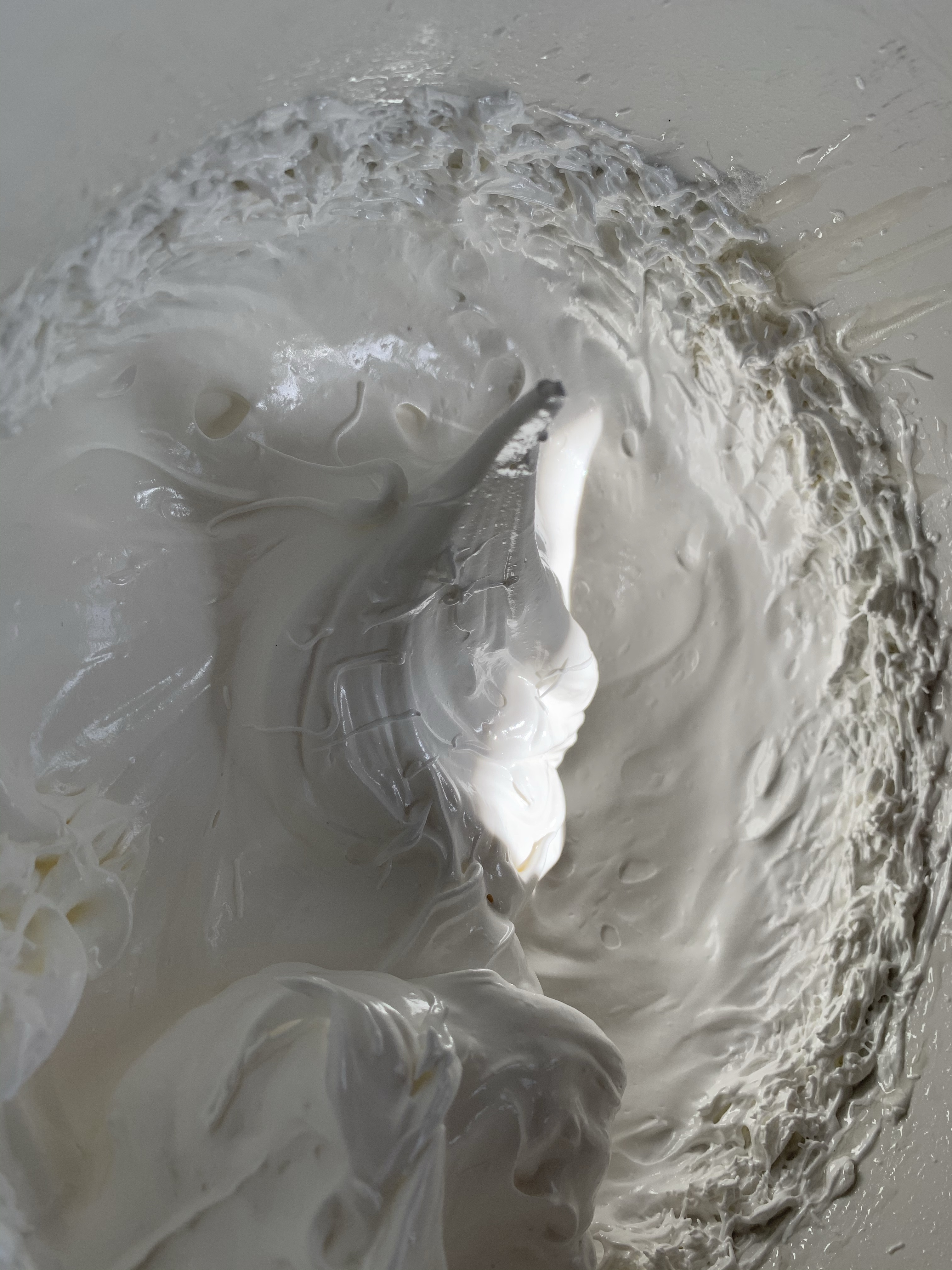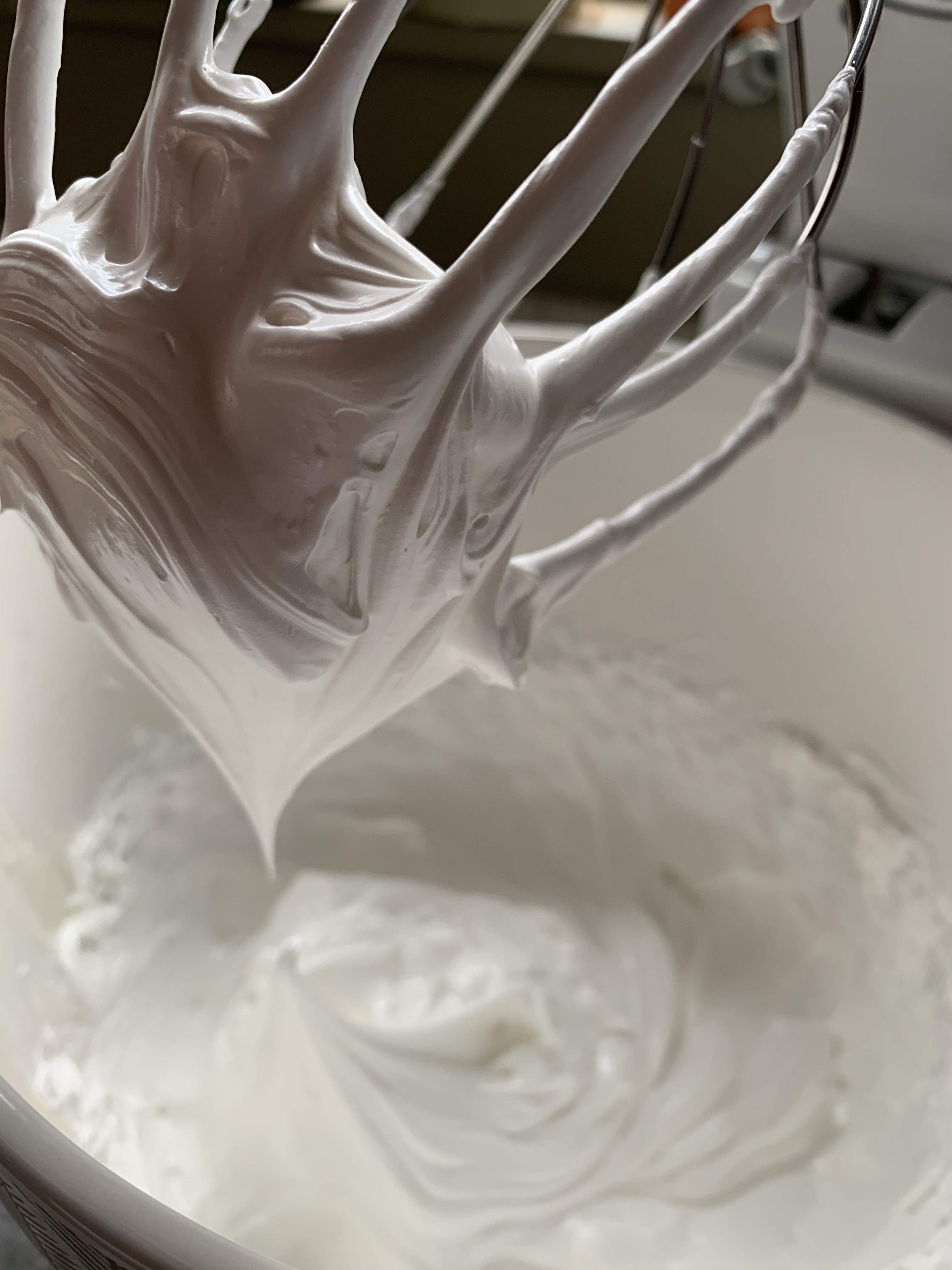 - You will slowly see your whites stiffen. The goal is to achieve STIFF, GLOSSY PEAKS. You will use the majority of your syrup but most likely not all of it. The key is to look for the stiff, glossy peaks and once achieved, stop adding syrup. I usually end up with less than a tbsp left.