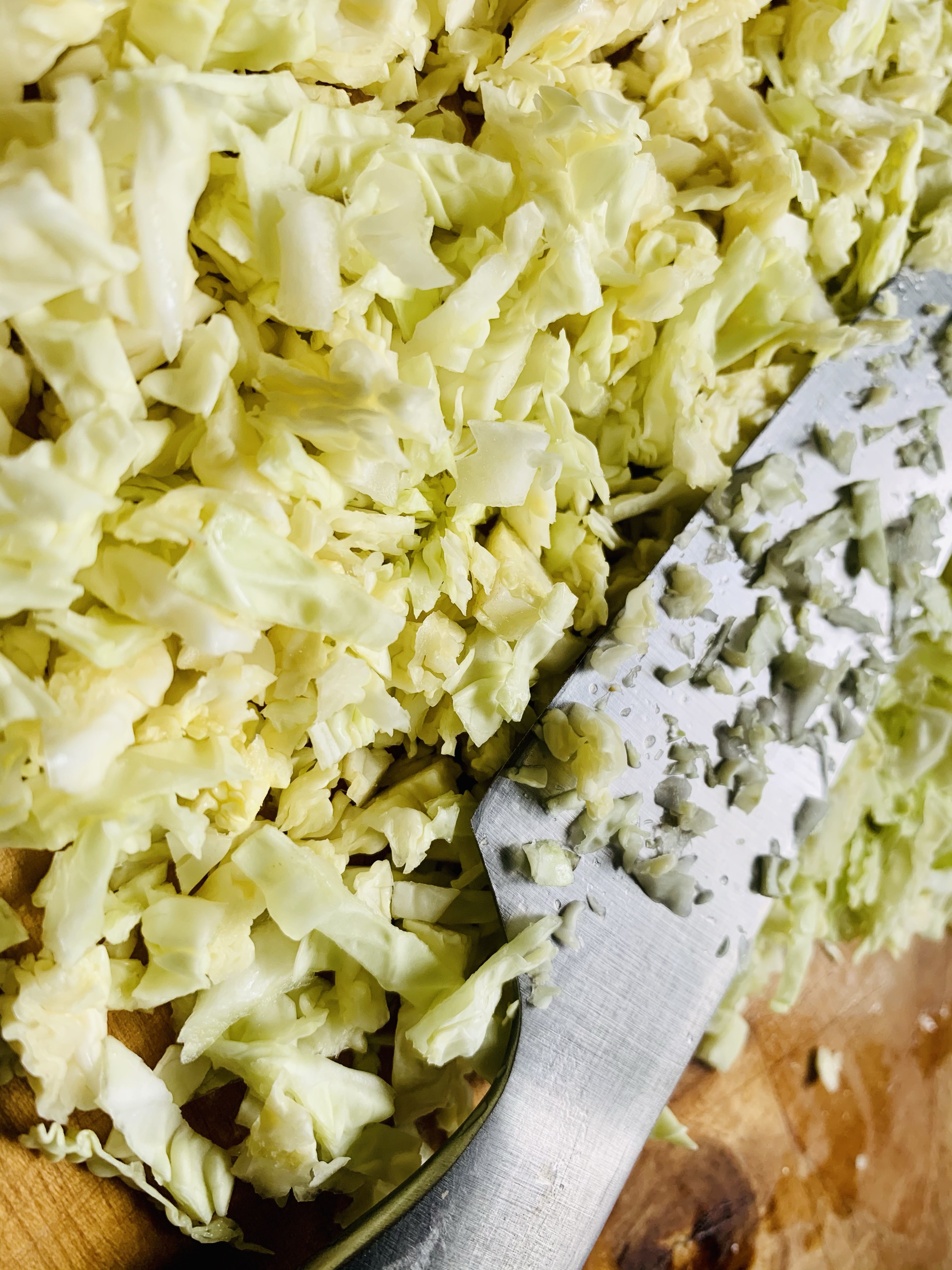 - 1/2 head of small cabbage, shaved/cut small (I had savoy which was perfect for this…. you want about 1-1.5 cups of cabbage when all is said and done.)