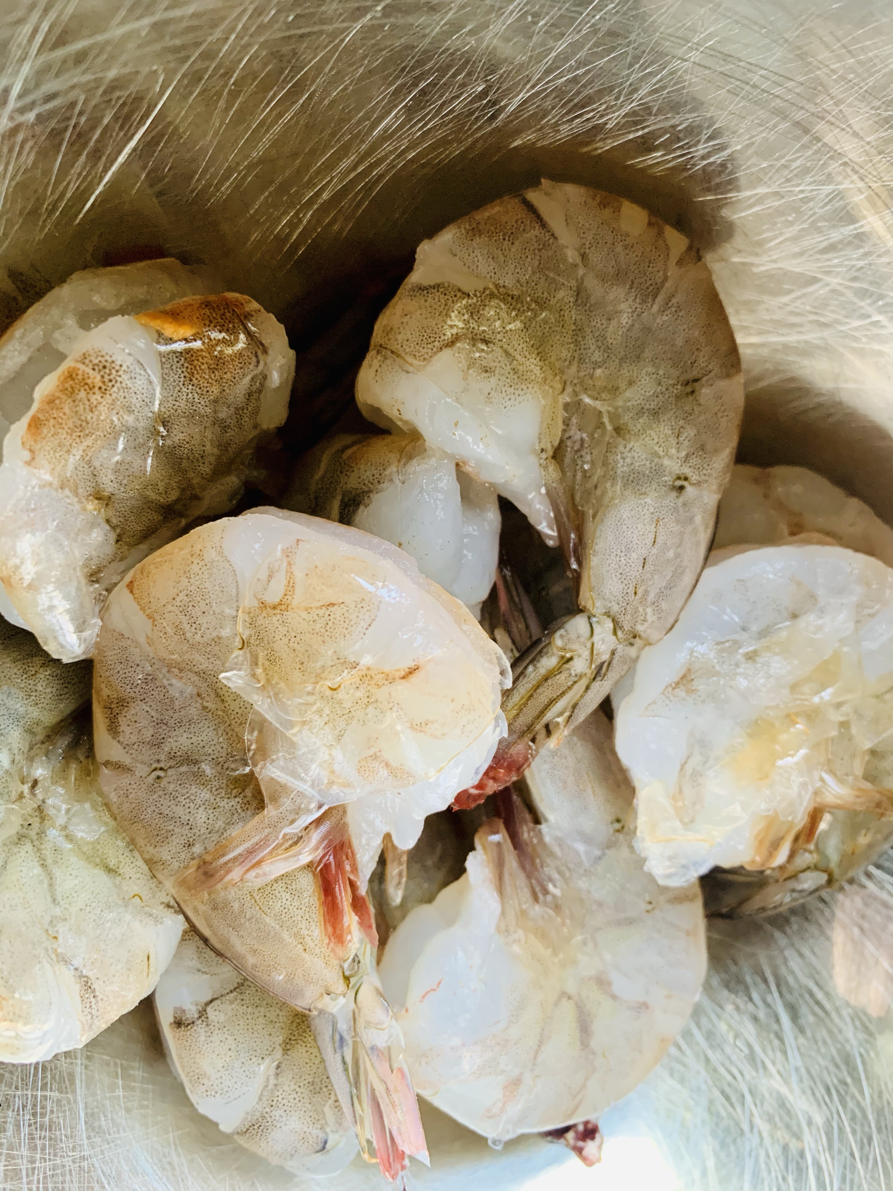 - 8 extra large shrimp, if frozen THAW them (more or less for your liking.. you could use up to a pound for this mix and it’d be great.) You will be smashing and chopping these up.