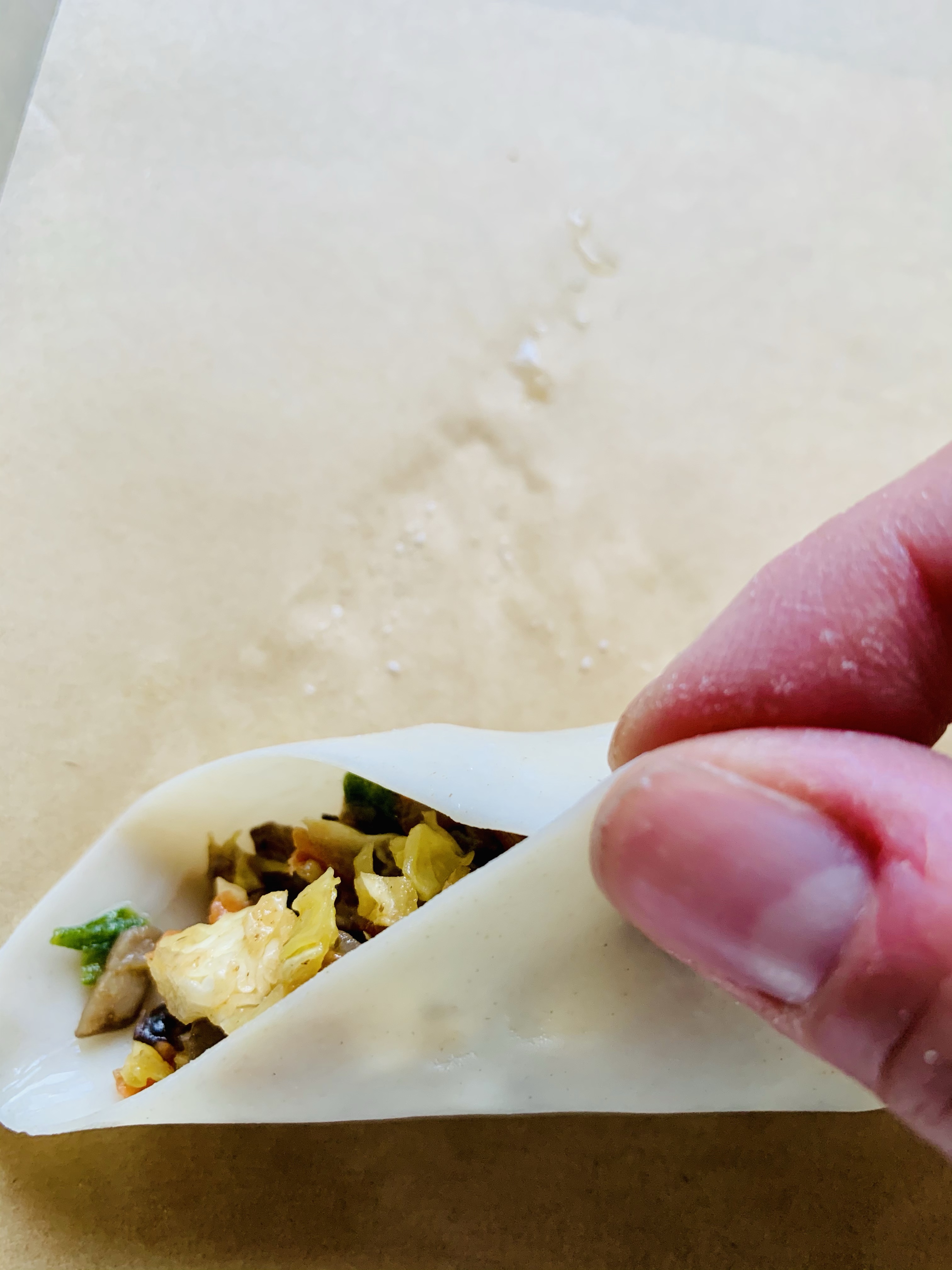 - Take your wrapper, and with a wet fingertip, trace the outside of the wrapper. This will be your seal.