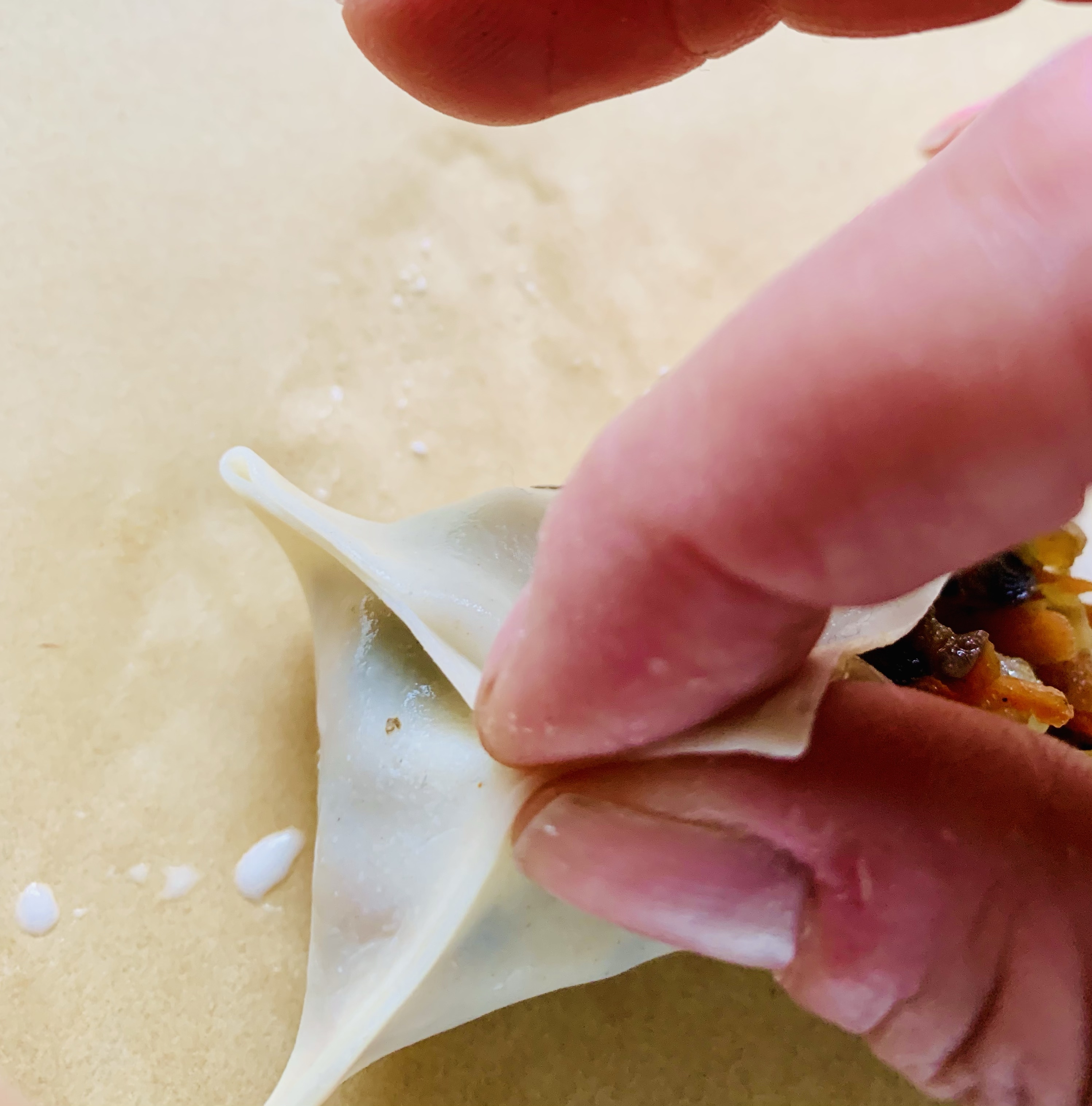 - Fold and seal. With mine, I used a square wrapper, wet along each edge, placed filling in the center then drew two opposite side corners together, and repeated again with the other two corners, pressing the edges together into what is called a Cross or Square fold (can be done with a round wrapper too!)