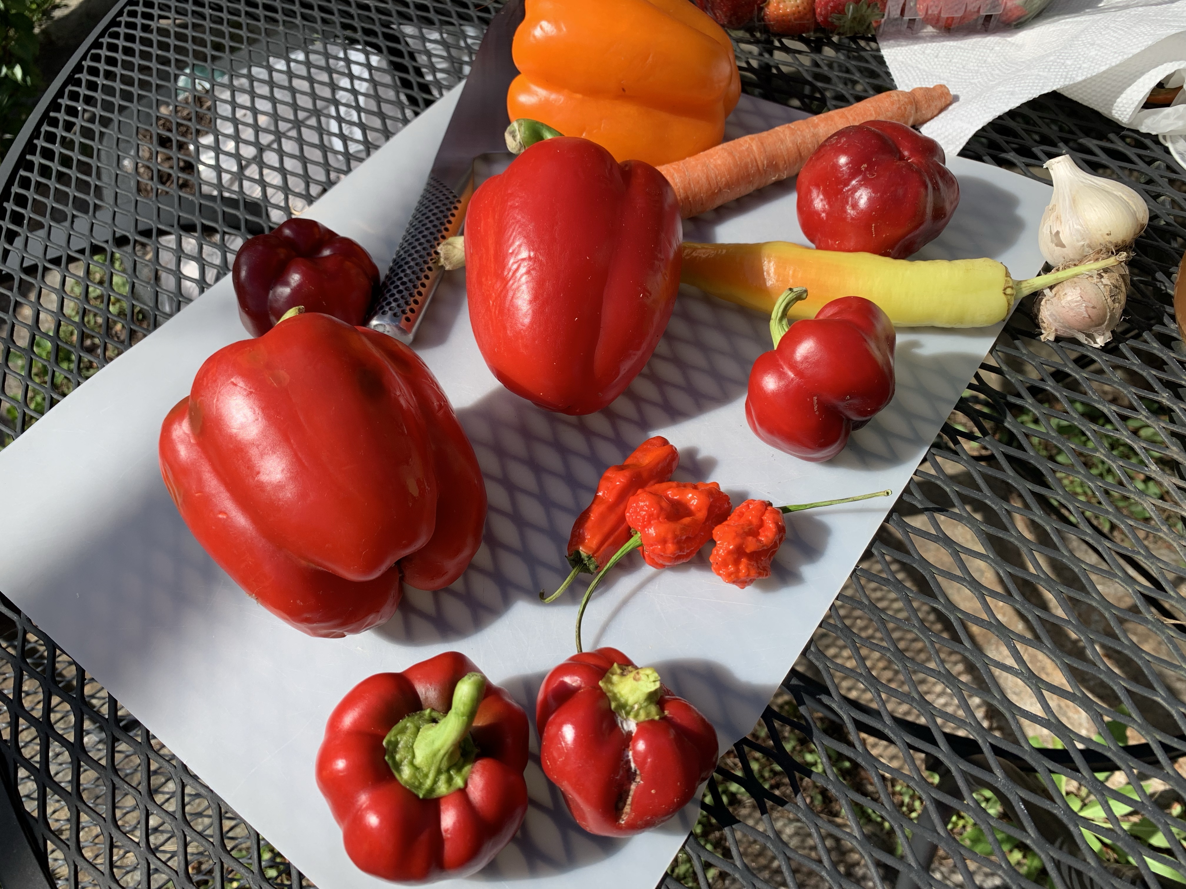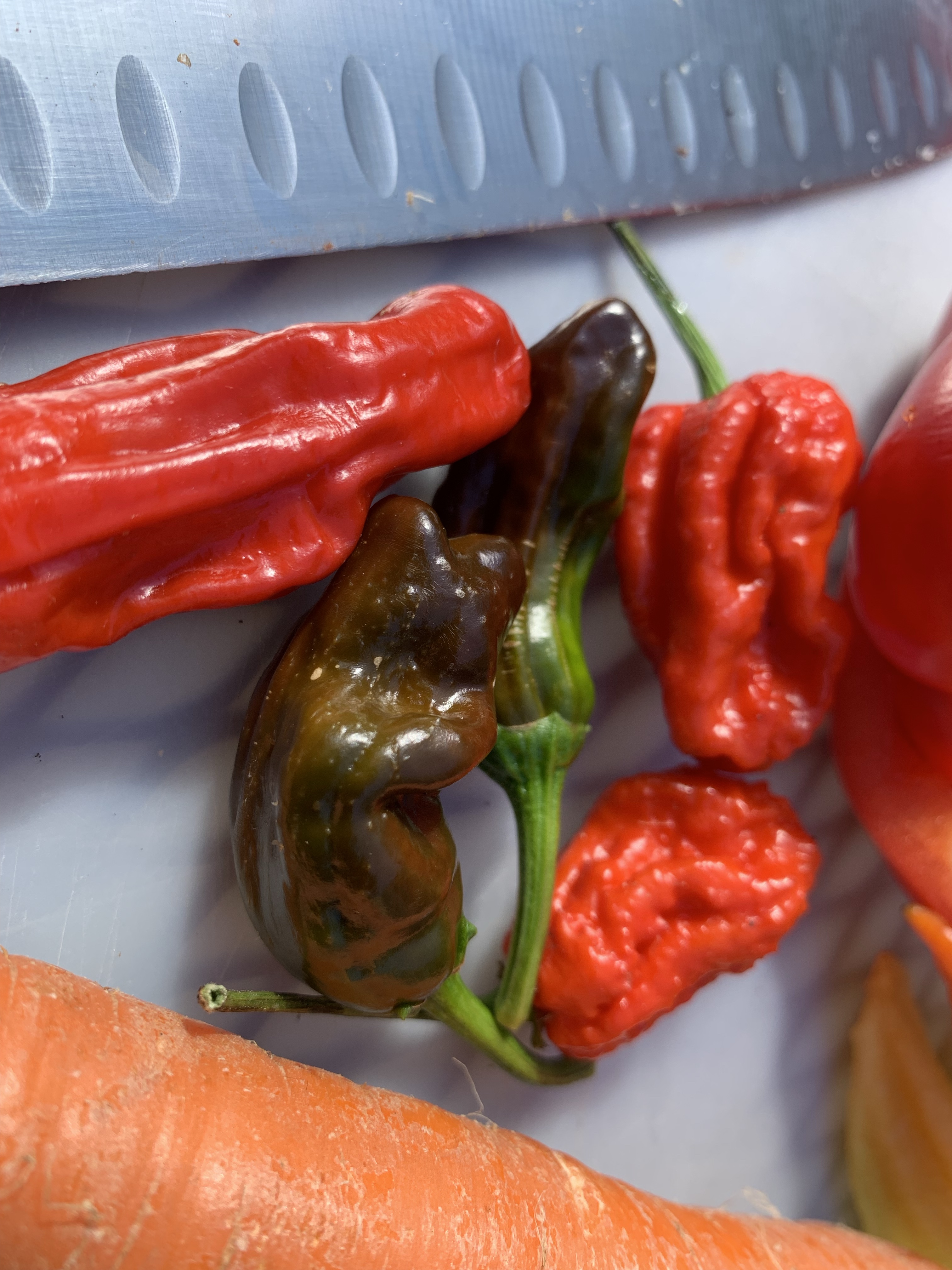 This year we grew Habaneros, Carbaneros, Fresnos, Cayenne, Scotch Bonnets, Anchos, Jalepeños and lastly, this baby: the Carolina Reaper. (cue demonic laugh) One plant – infinite burn. So far I have harvested 10 pods off it (with more on the horizon…)