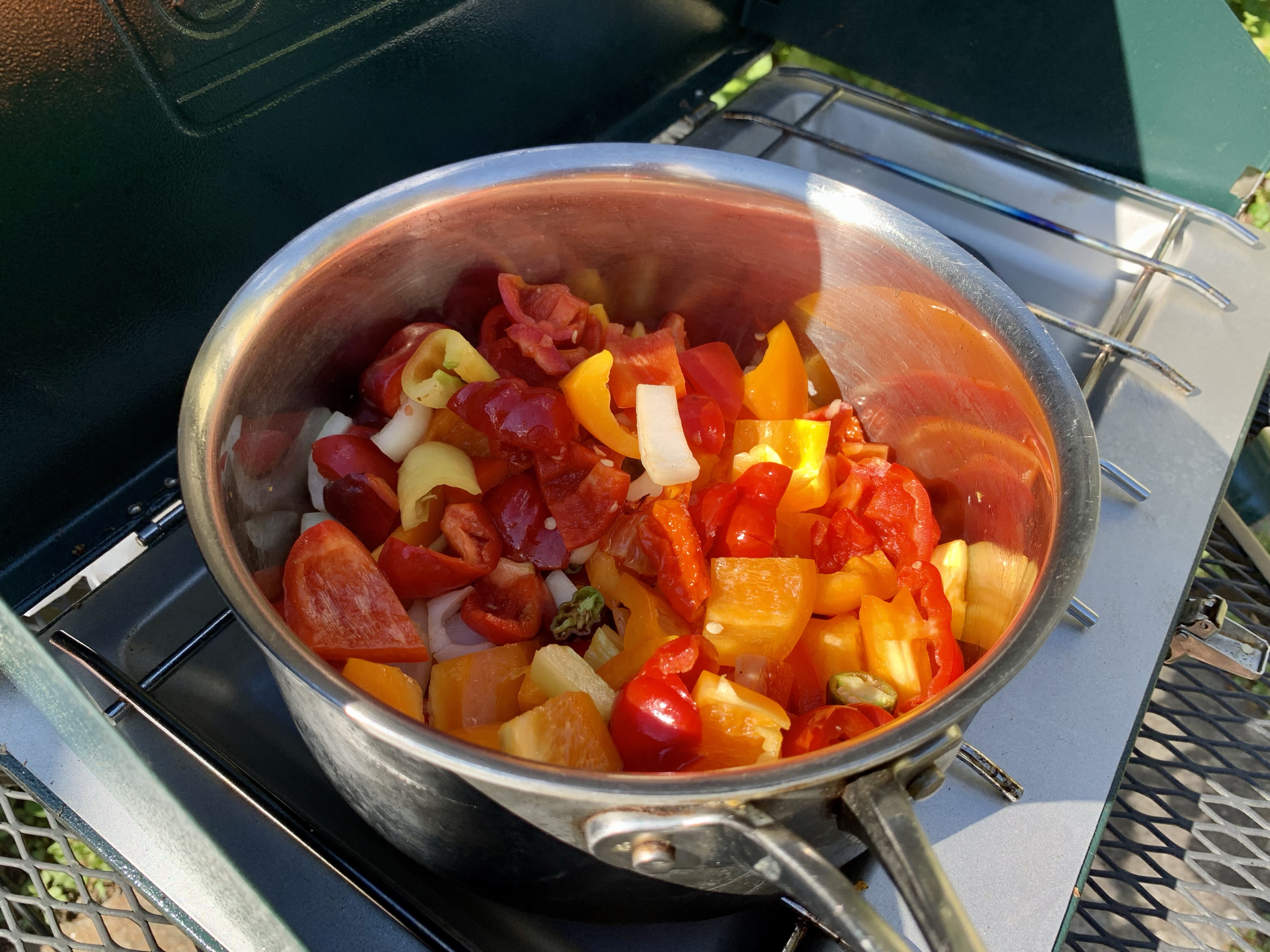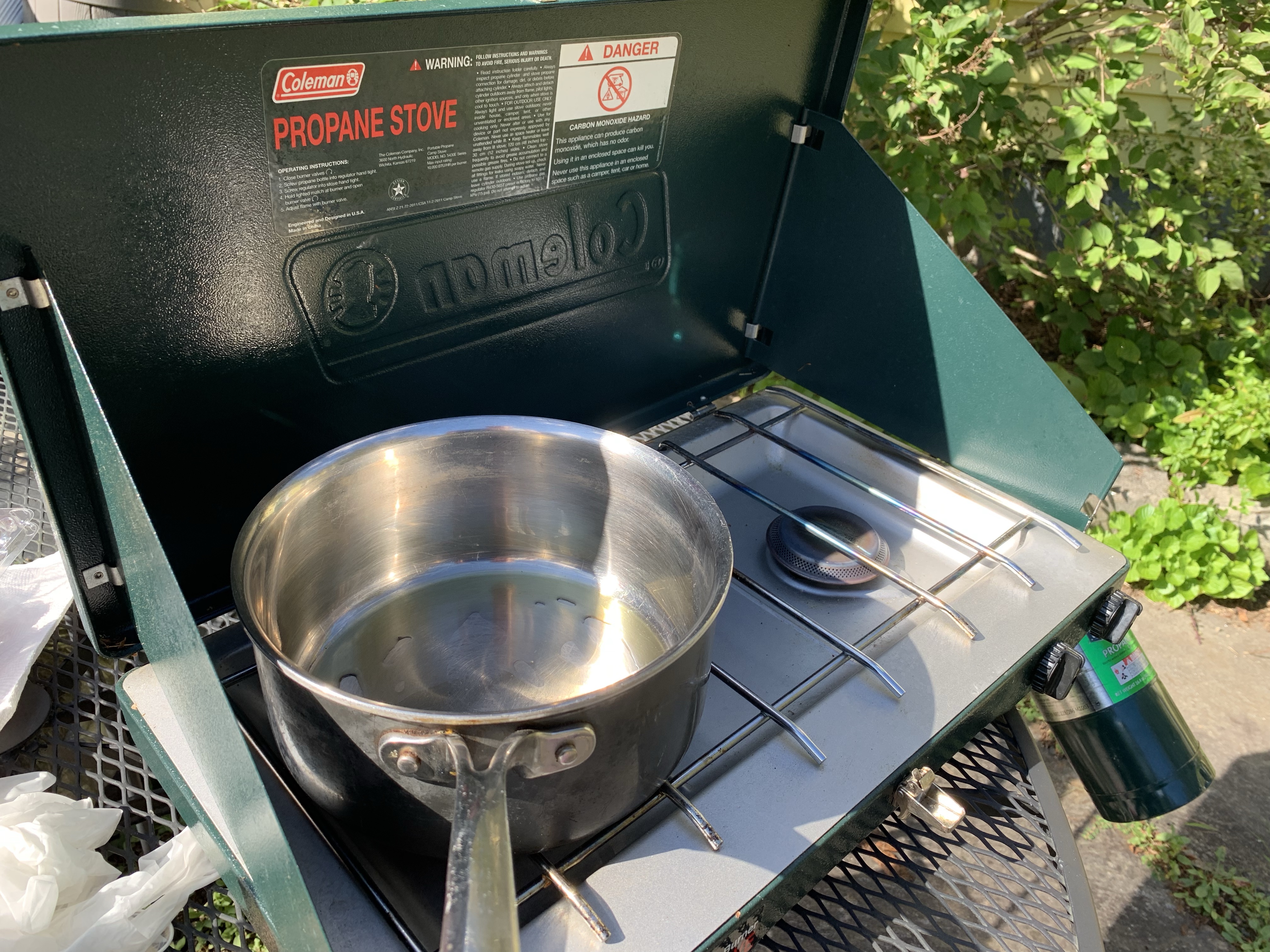 - Set up your camp stove and add the oil to a medium, heavy bottom sauce pan. DO NOT TURN ON STOVE YET.