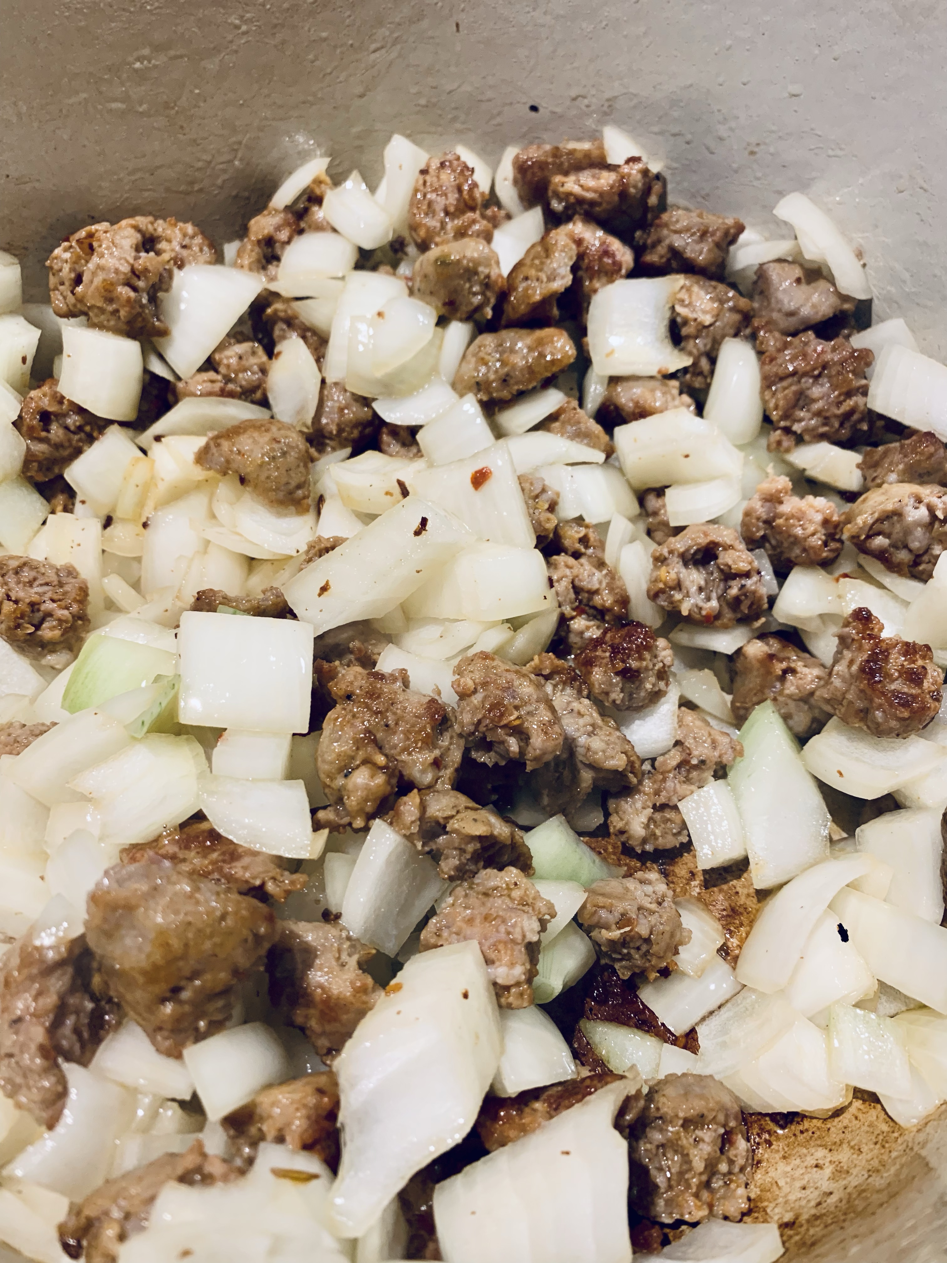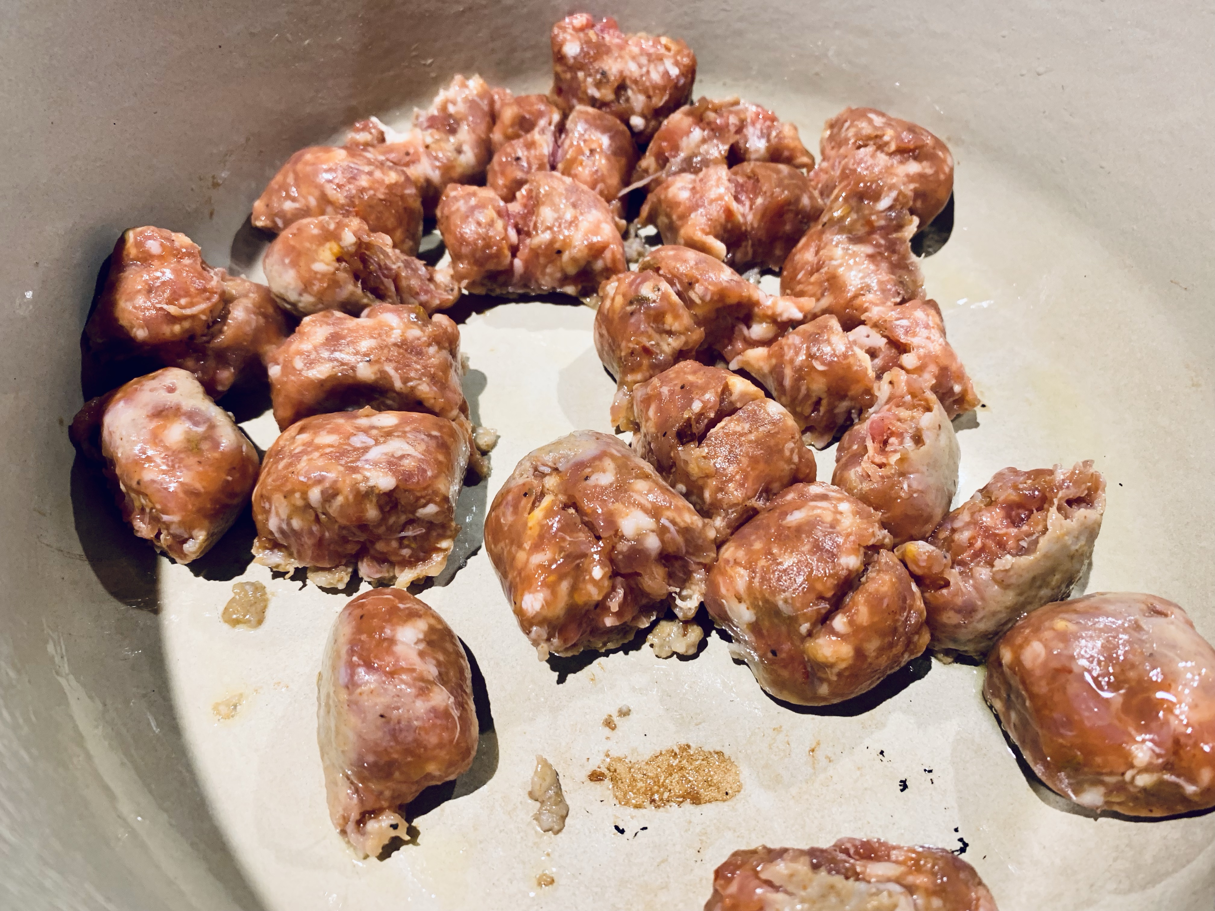 - Cook sausage (breaking up if using previously cased sausage) until cooked through and starting to crisp/brown on the edges.
