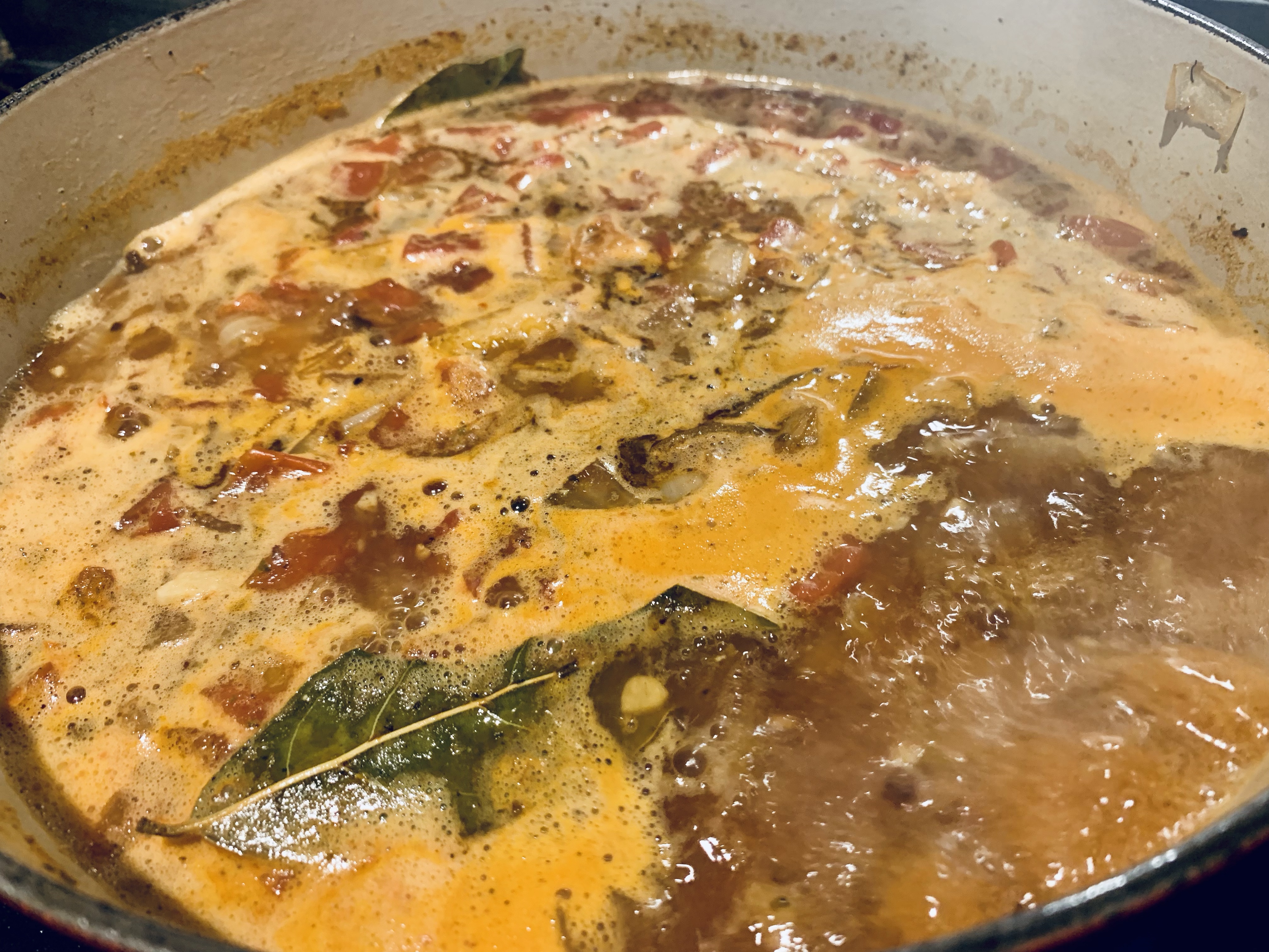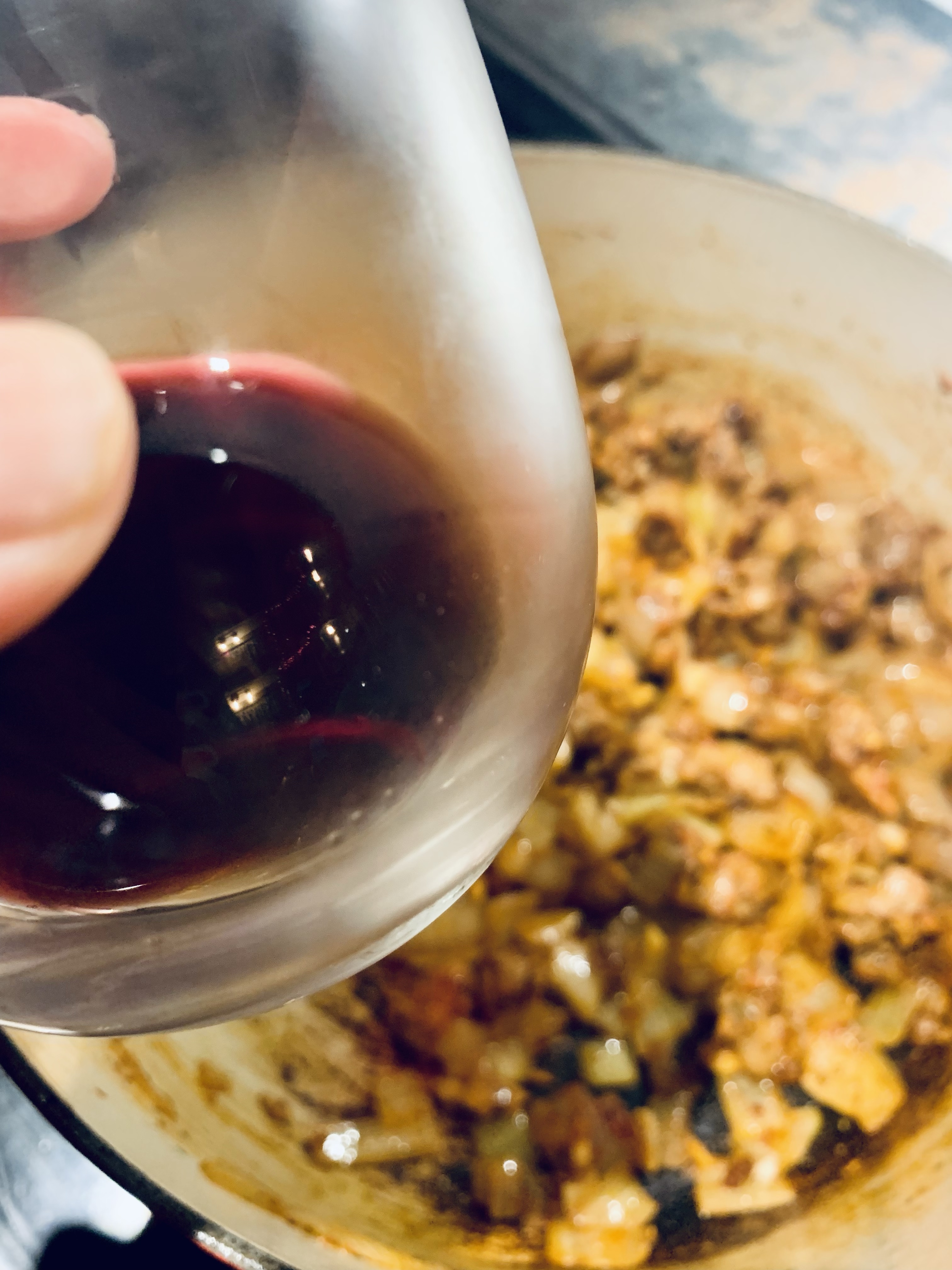 - Add in garlic, stir to combine and cook another 1 minute, once fragrant add in 1/4 cup of red wine and deglaze bottom of pot. Add in tomato paste. Stir to coat all ingredients and cook for a few minutes . It will be a very dark brick red seeming on the verge of seeming burned.