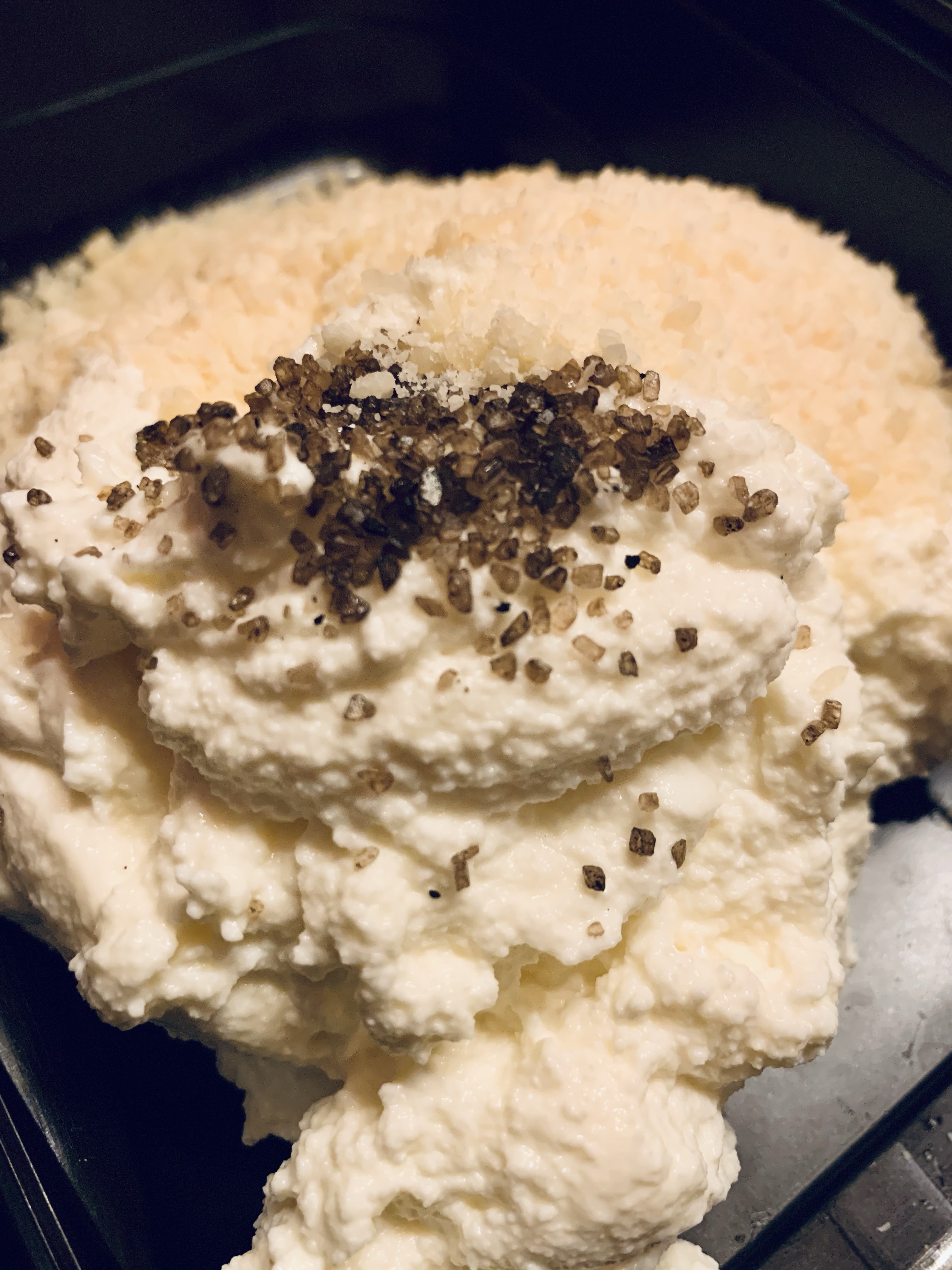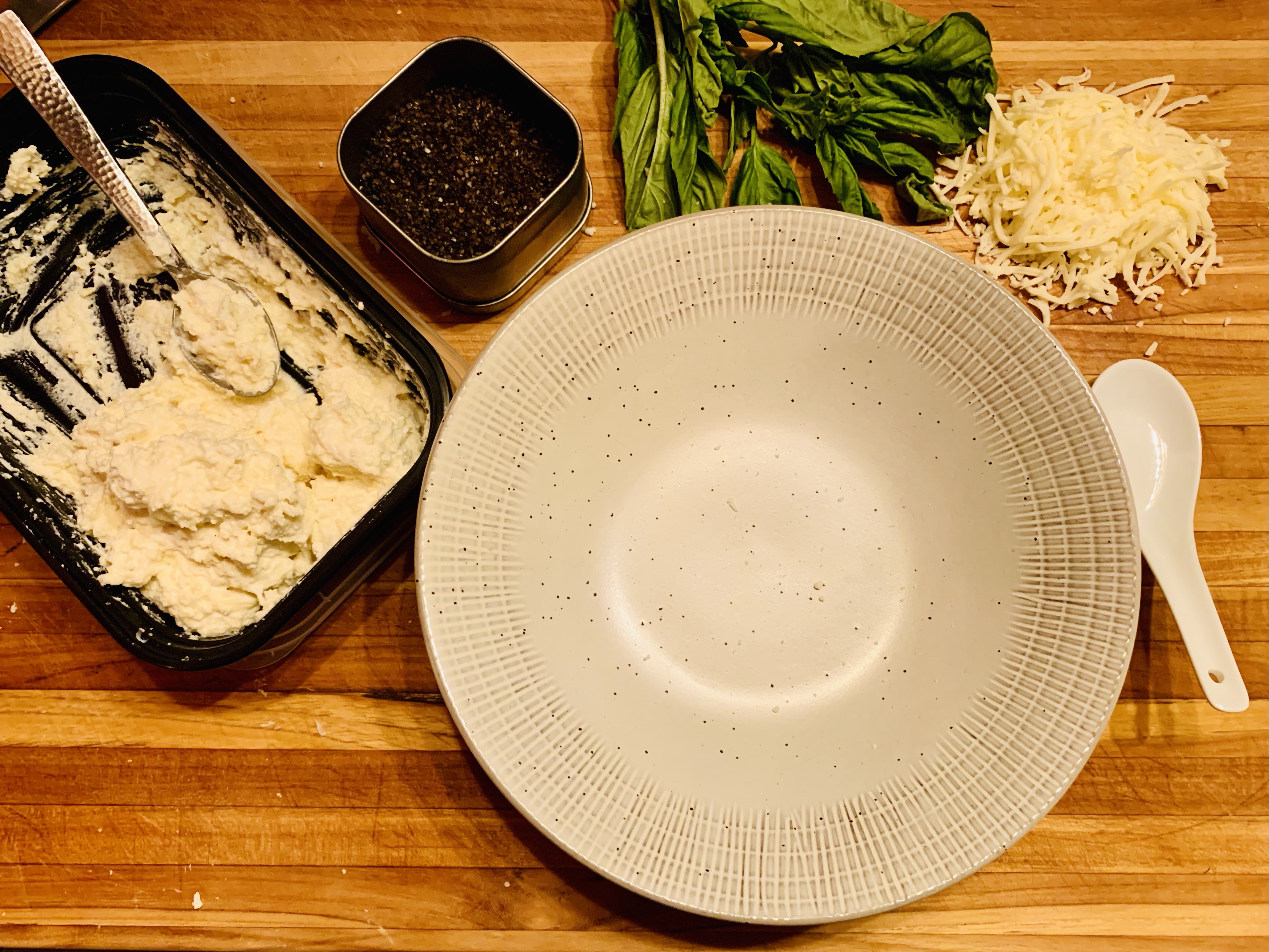 (NOTE: do not adjust salt, as you will be serving OVER the ricotta/parm mixture… adding saltiness to the total soup THERE. If needed, you can always finish a pinch of salt to get to your preferred saltiness. I never find I need it.)