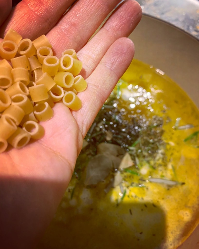 This is a great soup for many reasons, but I would caution IF FREEZING, do NOT add in the pasta, but just freeze the rest of the soup. If CANNING, you can add the noodles. If eating immediately over a few days? Add pasta and make the companion broth. (NOTE: I make this broth to have on hand and drink whenever I am feeling a bit of a cold coming on. I make it extra garlicky, extra gingery and lemony and add in some red pepper flakes. It’s that good!)