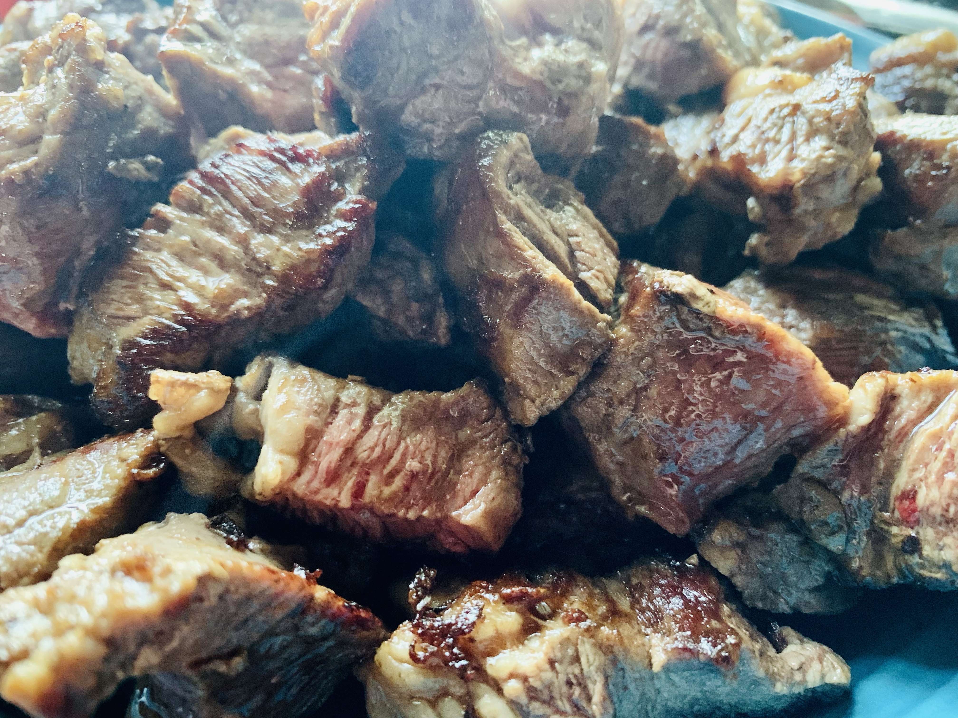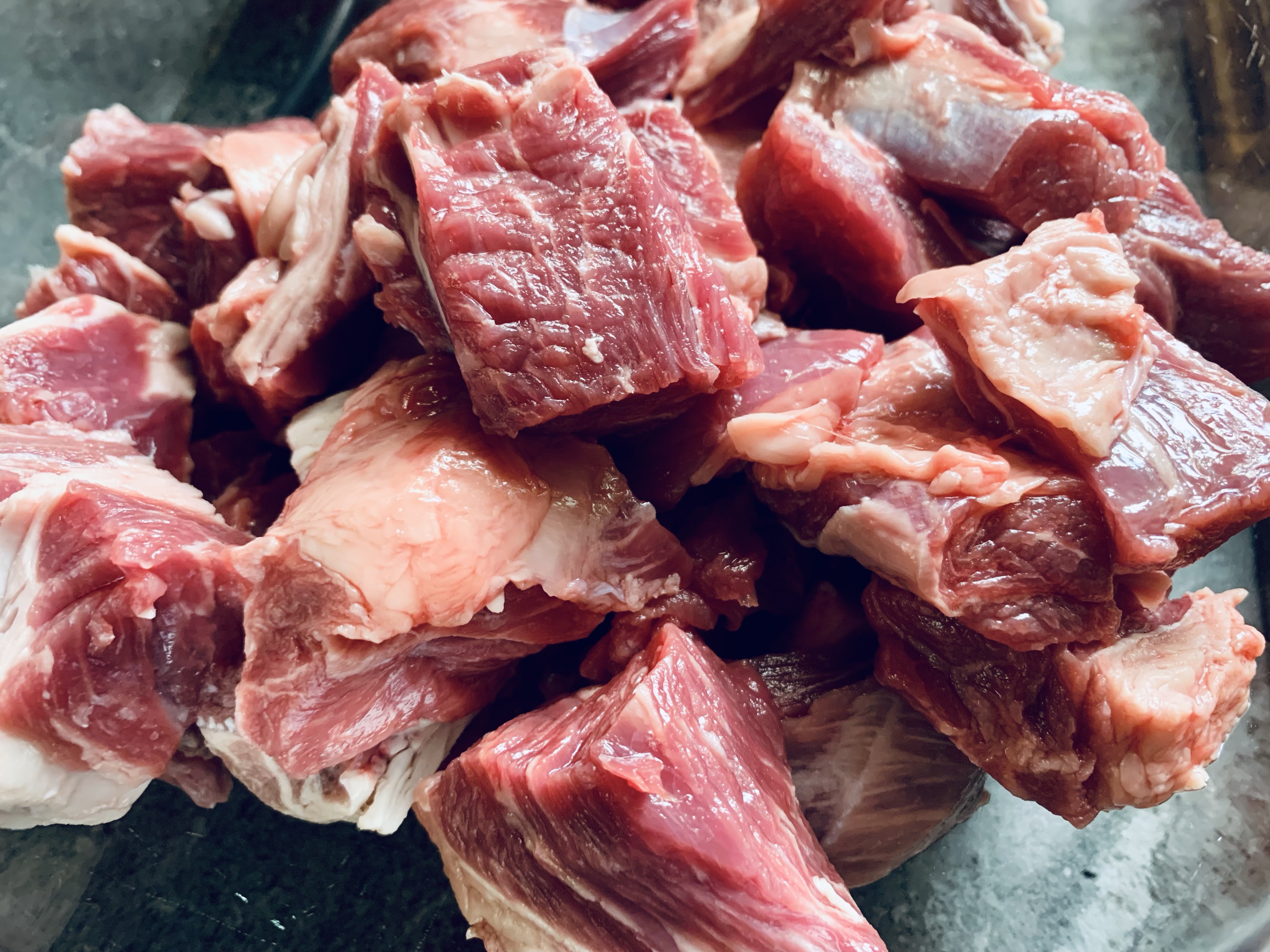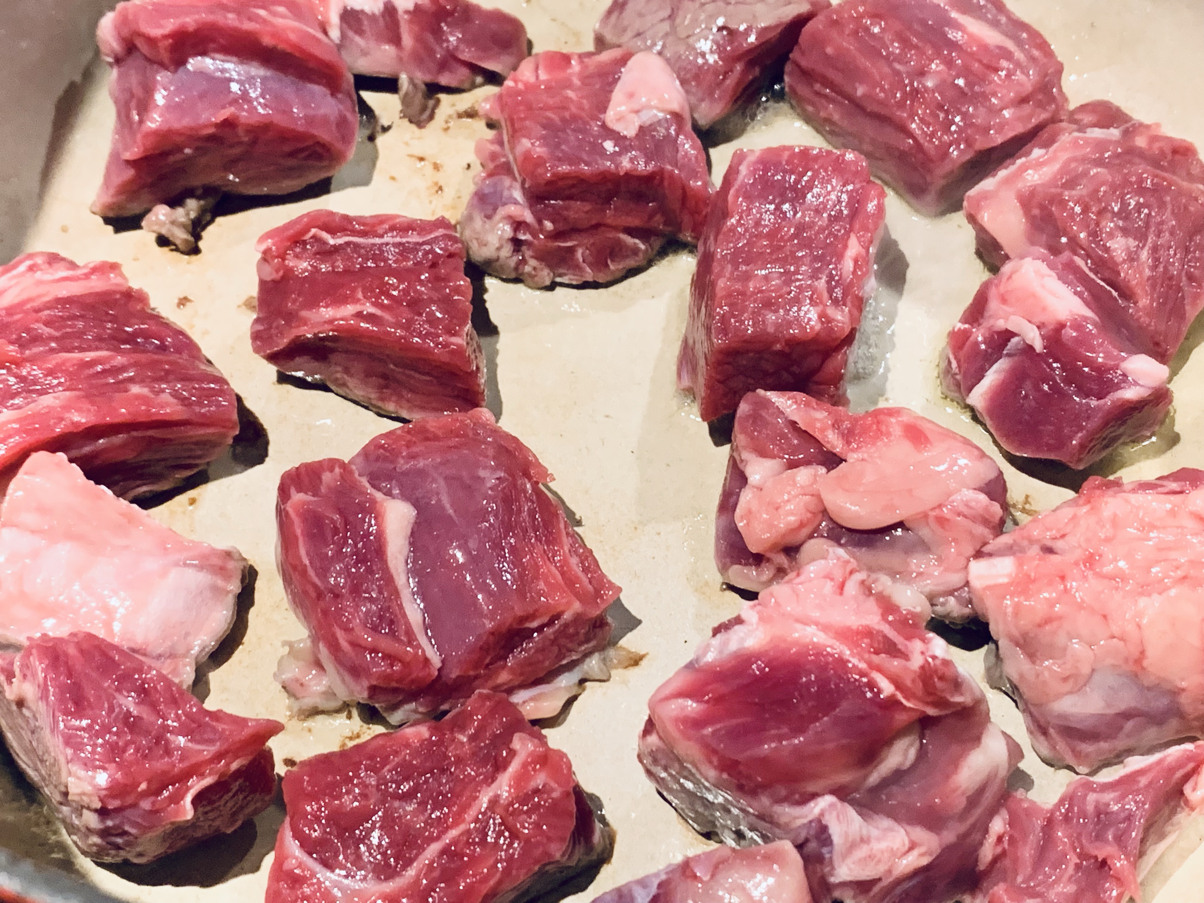 • 3 lbs beef chuck, cubed into 2″ pieces (steak or roast)