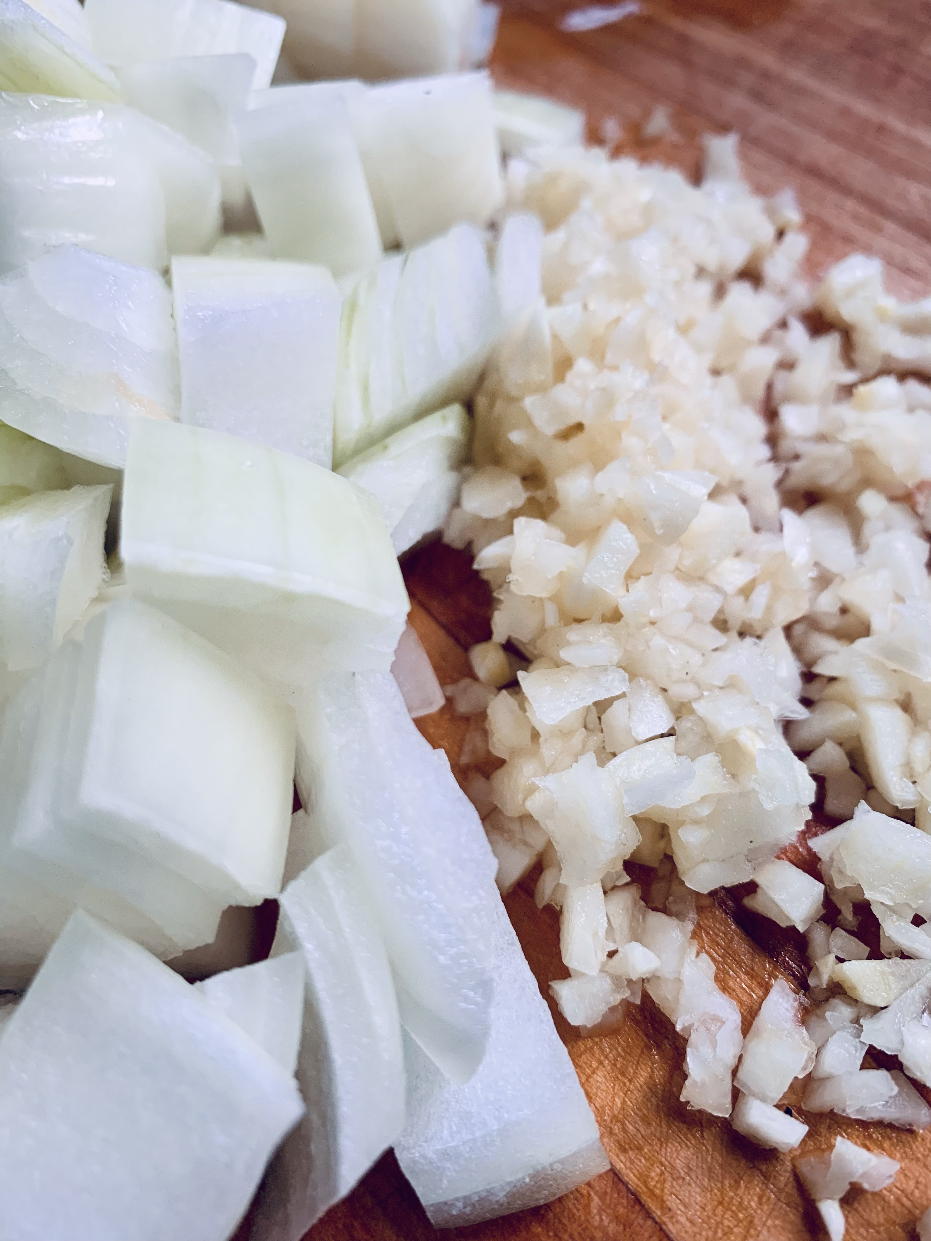 3. Add onion and garlic to dutch oven and cook until fragrant and onion is translucent.