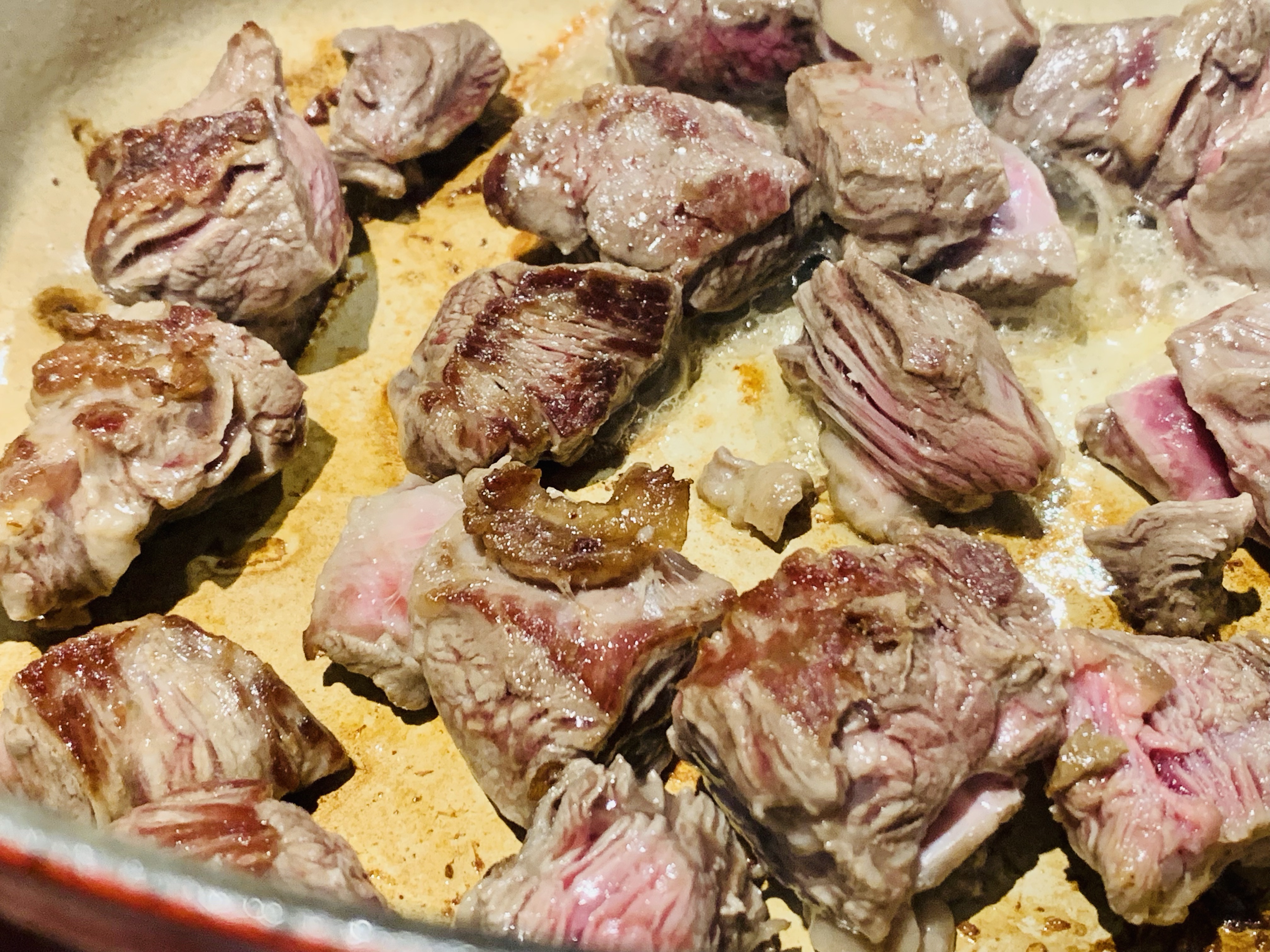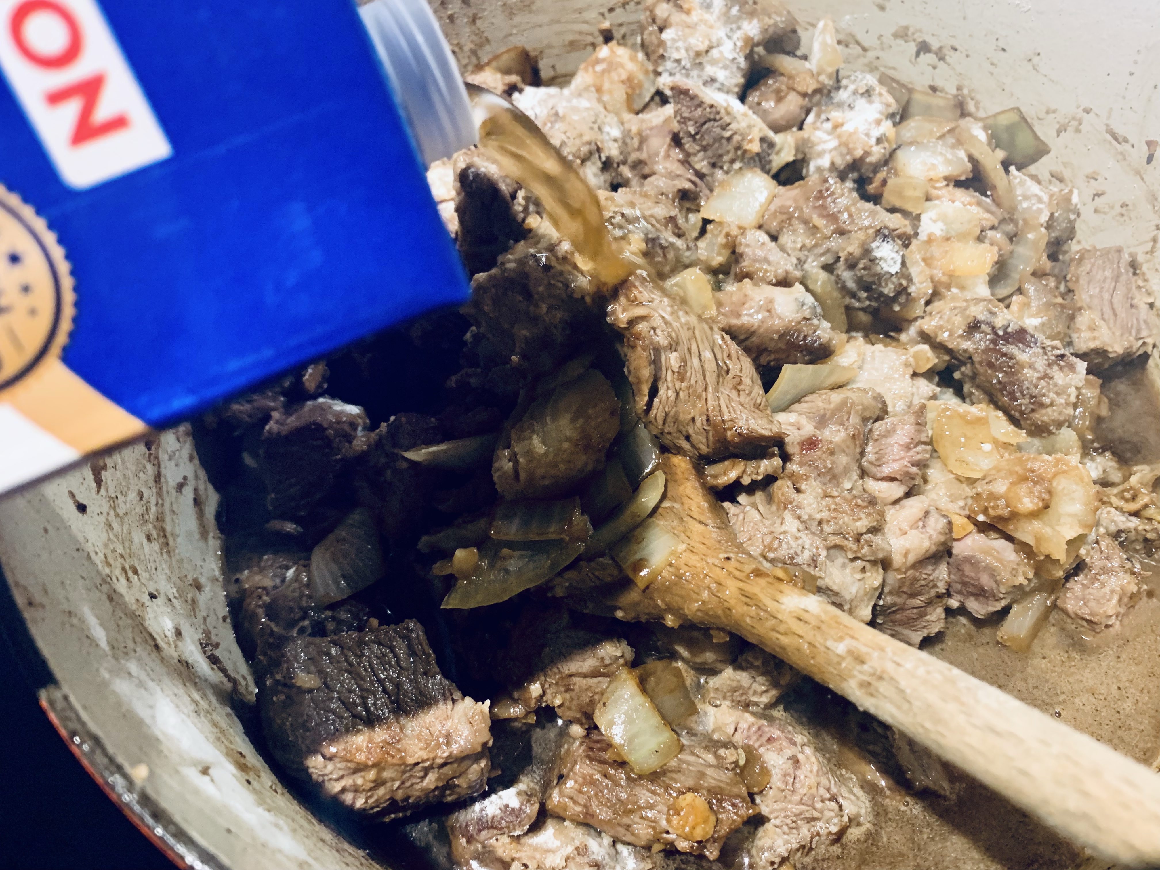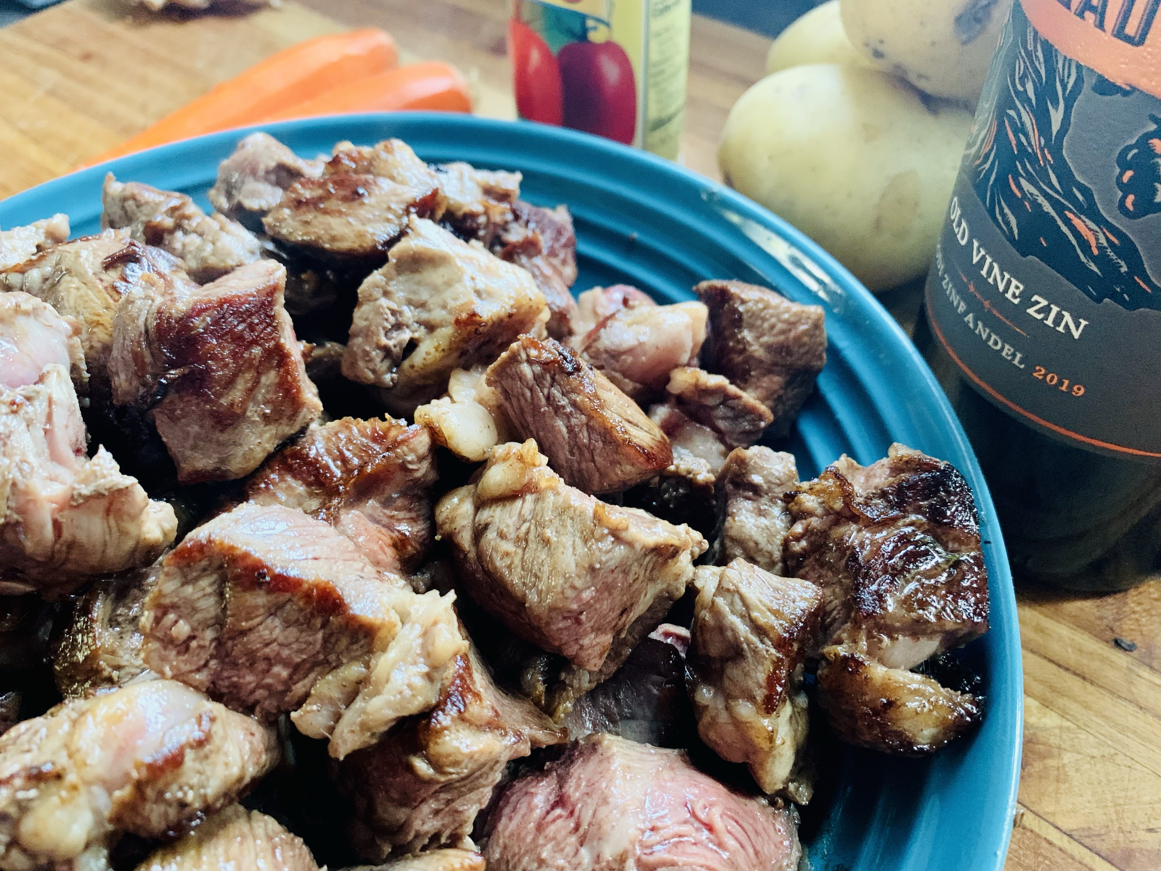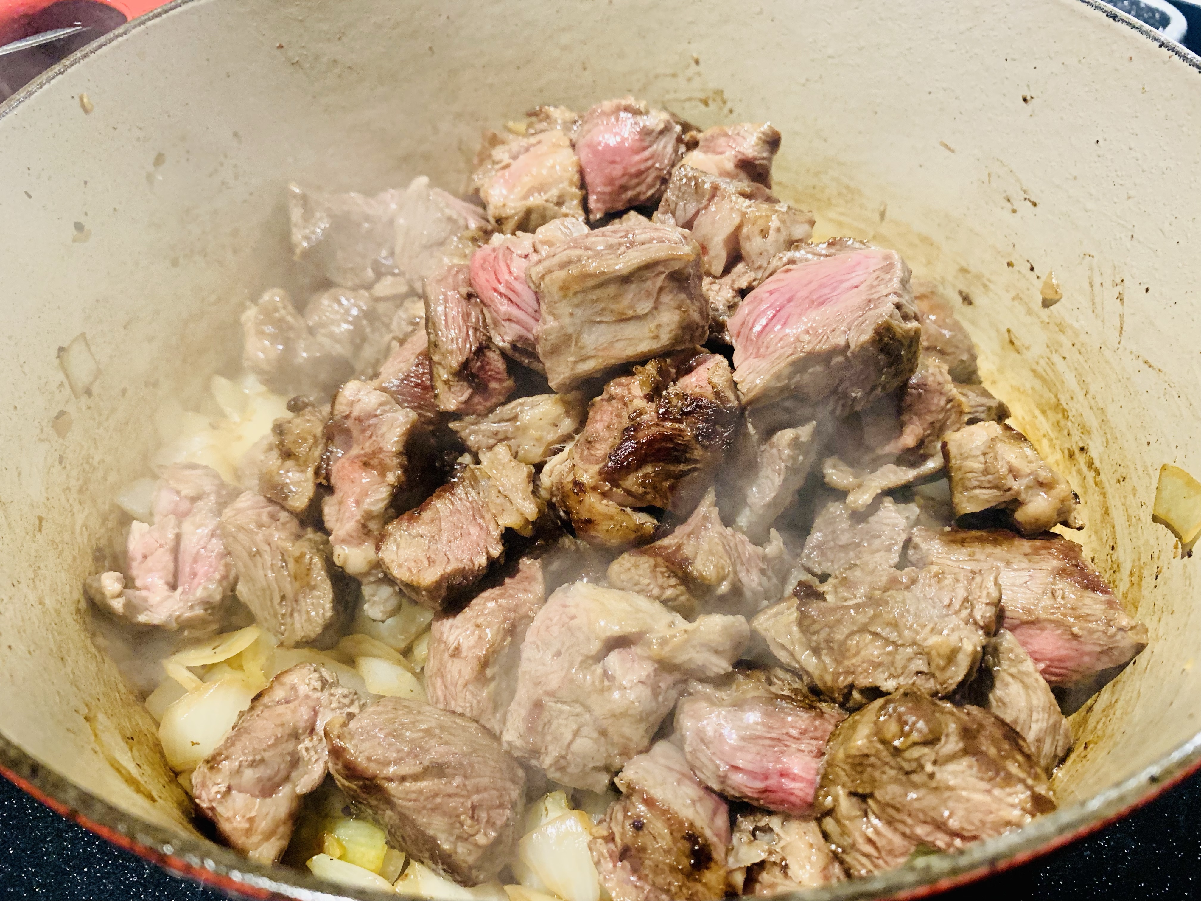2. Set Dutch oven over medium high heat. Using a tbsp of olive oil at a time, brown the beef cubes in a single layer for 2 minutes one one side, flip and brown another 2 minutes. Remove par-cooked beef and place on a plate. Continue with remaining beef and oil.