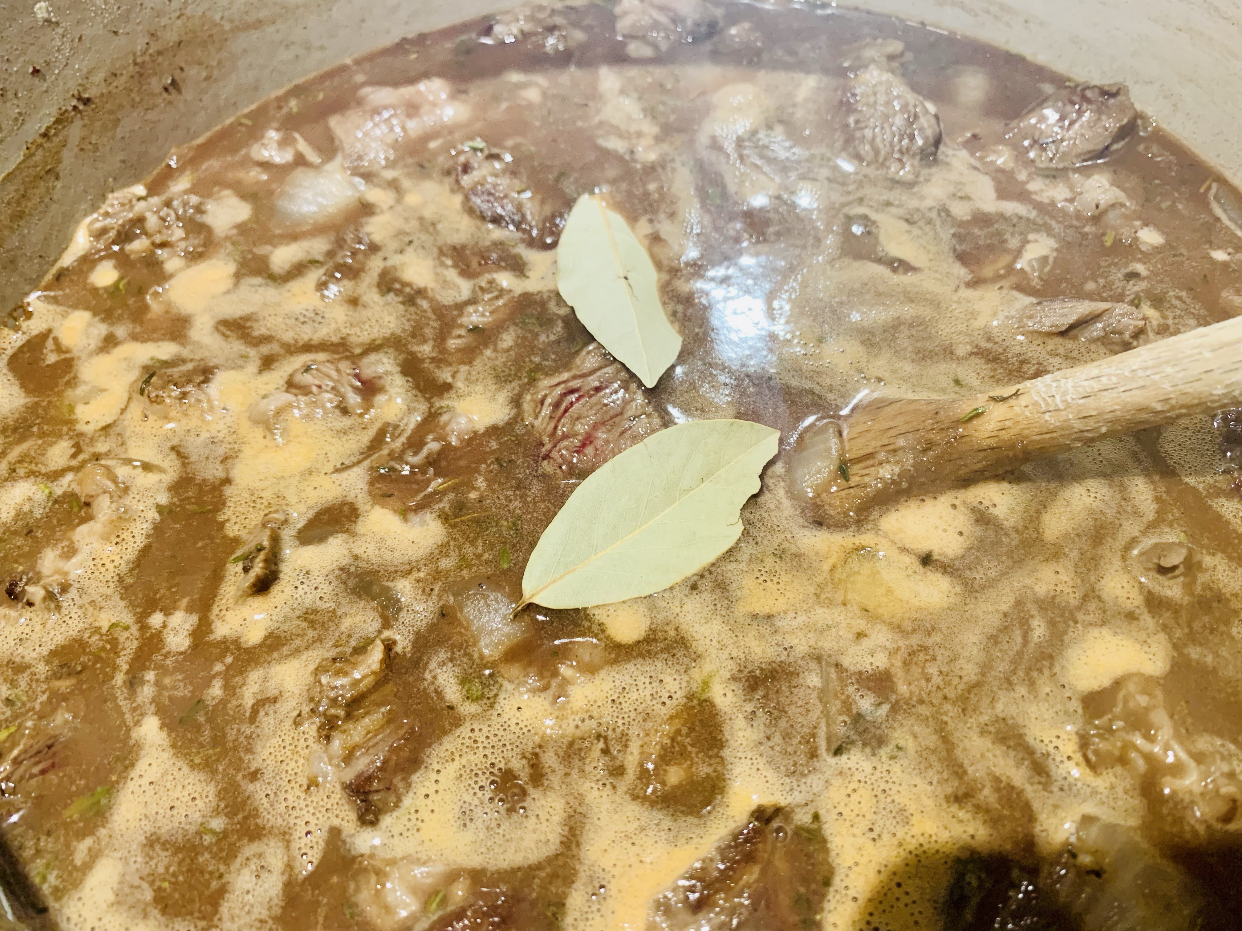 6. Add stock, wine, vinegar, salt, spices and bay leaves. Stir to combine.