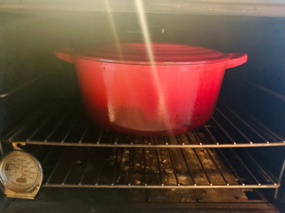 1. Preheat oven to 350degrees. Make sure you remove any racks in the upper half of your oven (to allow for COVERED dutch oven or braiser to be placed inside.)