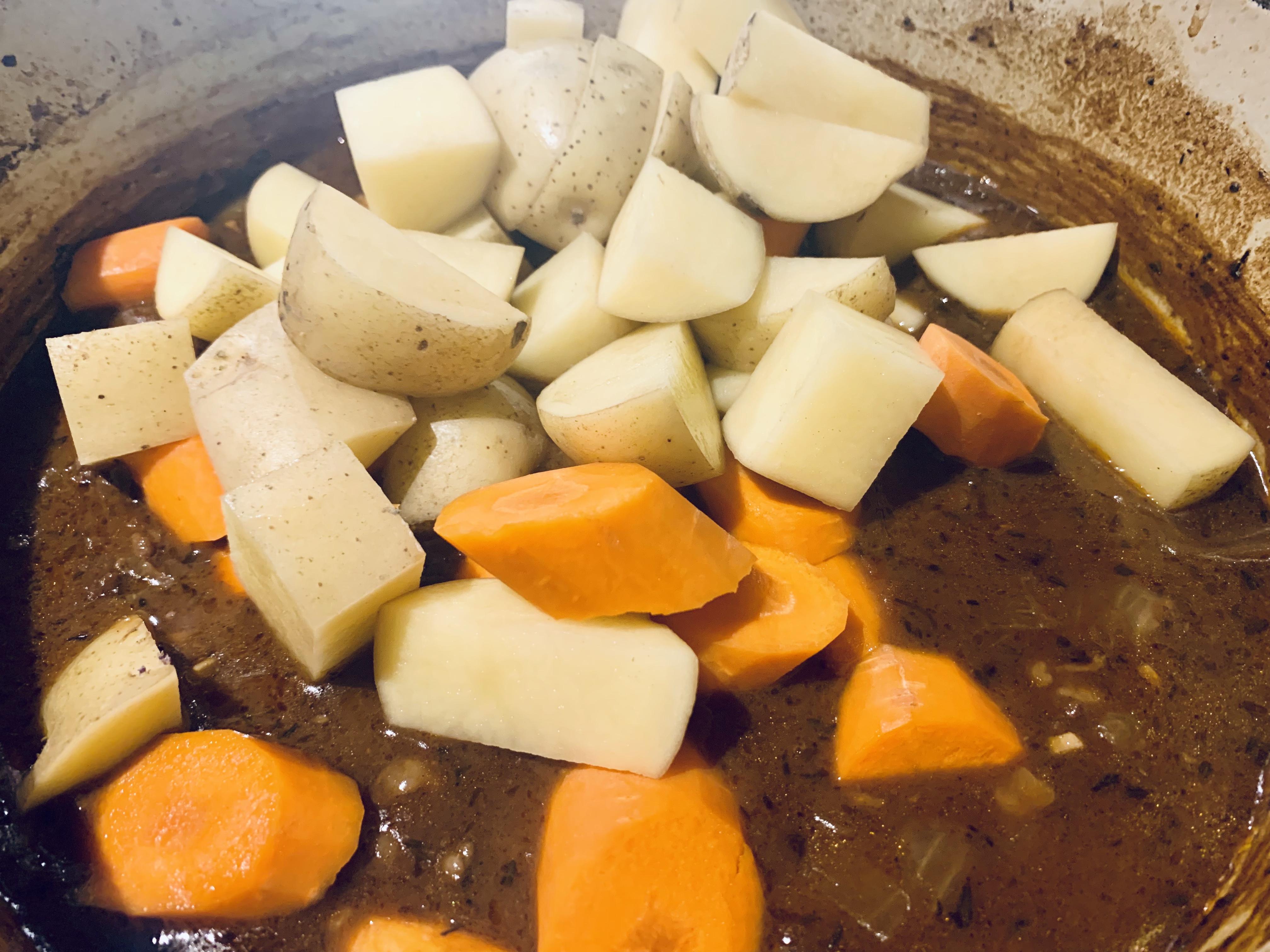 9. At the 2 hour mark, remove from oven, stir and add in potatoes and carrots. Stir to combine and settle the newly added veggies below the liquid.
